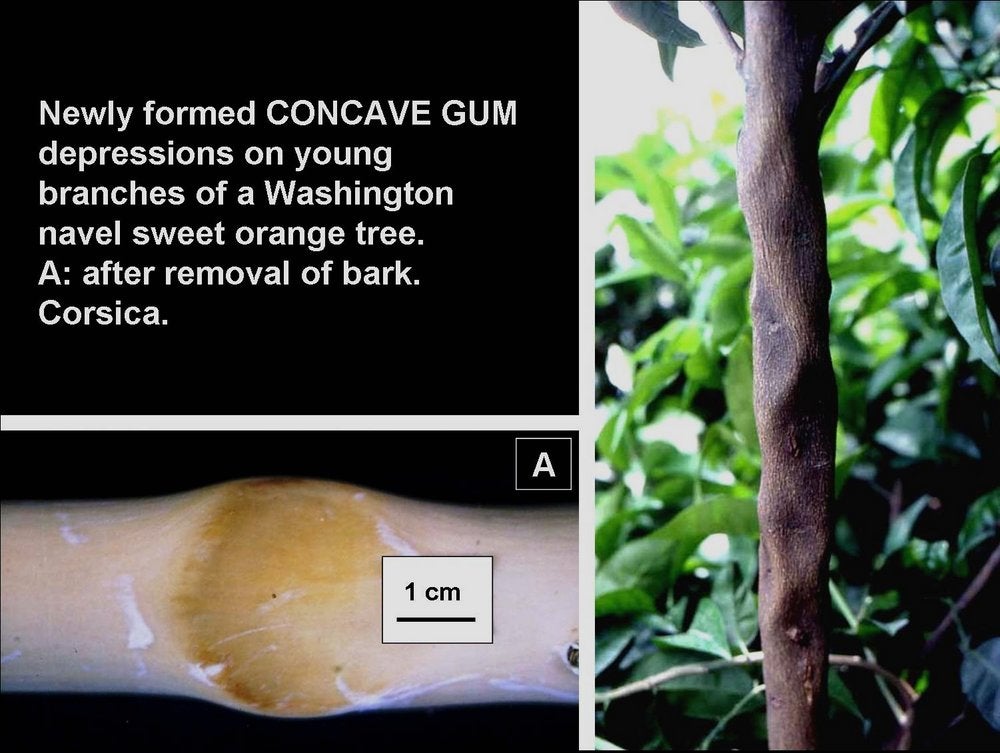 Distribution and importance. The disease is largely present in the Mediterranean region although it is now found worldwide. Injury develops slowly but may distort trunks and branches considerably (CG-BP. 03, 10, 11, 12, 13) and damage trees severely. Many spectacular cases were seen on old line mandarin and sweet orange trees in Corsica (Vogel, 1961). Concave gum disease can be quite severe and very debilitating to young trees (D'Onghia et al., 1992). As the disease is not transmitted by insects or mechanically, it has disappeared from orchards started with citrus material certified free of graft-transmissible agents.