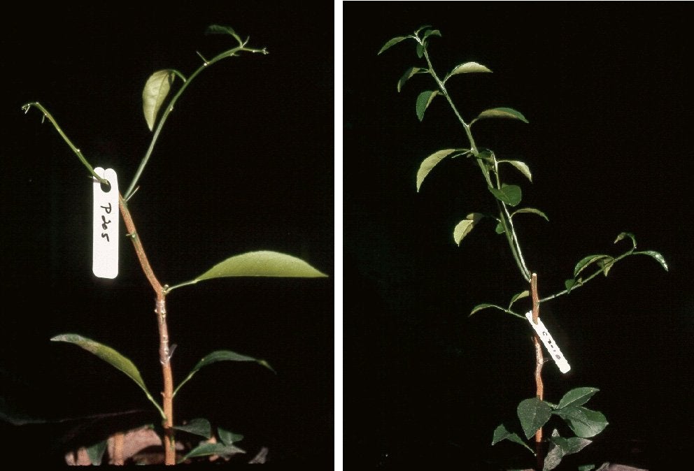 LEFT. Shock symptoms on sweet orange seedling graft-inoculated with Psorosis A virus. Shock symptoms (wilting, bending and decline) are observed of the first young shoots developing after inoculation and cutting back the index seedling. RIGHT. No shock symptoms develop on sweet orange seedling graft-inoculated with the agent of concave gum-blind pocket, cristacortis or impietratura. C. N. Roistacher