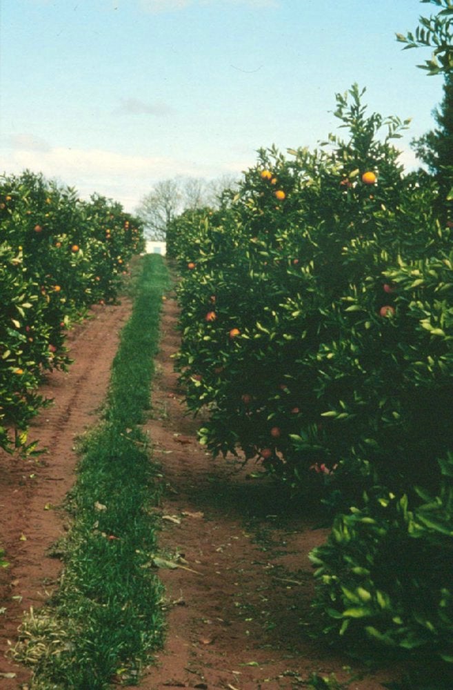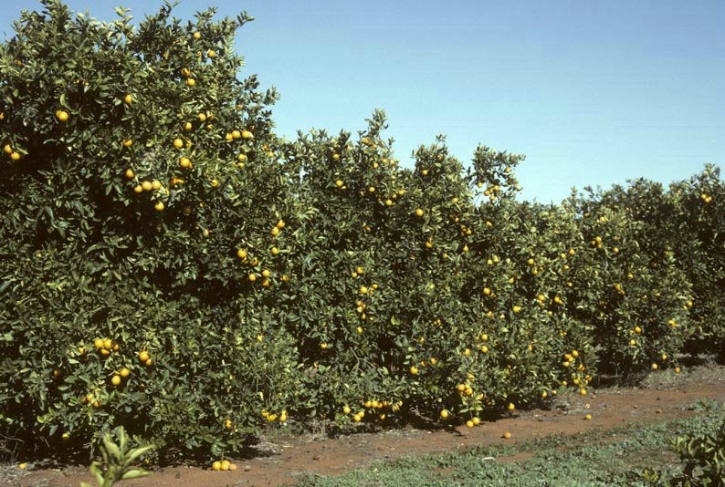 A commercial block of Washington navel oranges on Poncirus trifoliata inoculated in the field one year after planting with CVd-IIIa, growing at Leeton, NSW Australia. NSW DPI - P. Broadbent