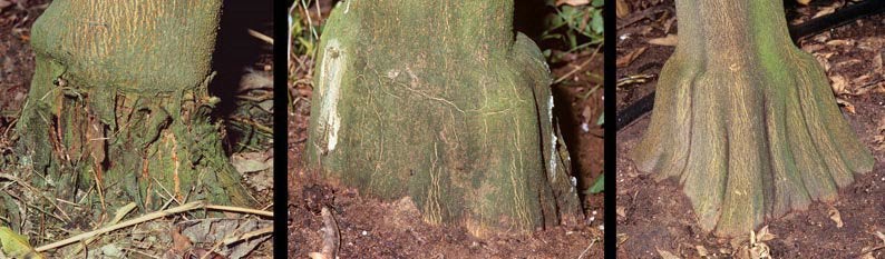 In trees grafted on P. trifoliata, dwarfed with natural viroid isolates often containing more than one viroid and in the absence of CEV butt scaling, the stock is broader than the scion trunk and often predominantly shouldered or benched at the bud union, in contrast to non-inoculated trees in which the stock is fluted and evenly expanding from the bud union to the crown roots (GTD. 04). The bark of the stocks of viroid-dwarfed trees varies from smooth, sometimes with “tessellation” to thin flaky bud scales or persistent corky pustules arranged singly or grouped or in horizontal bands and some trees with an indented ring at the bud union, visible when the bark was removed (Fraser and Broadbent, 1979).