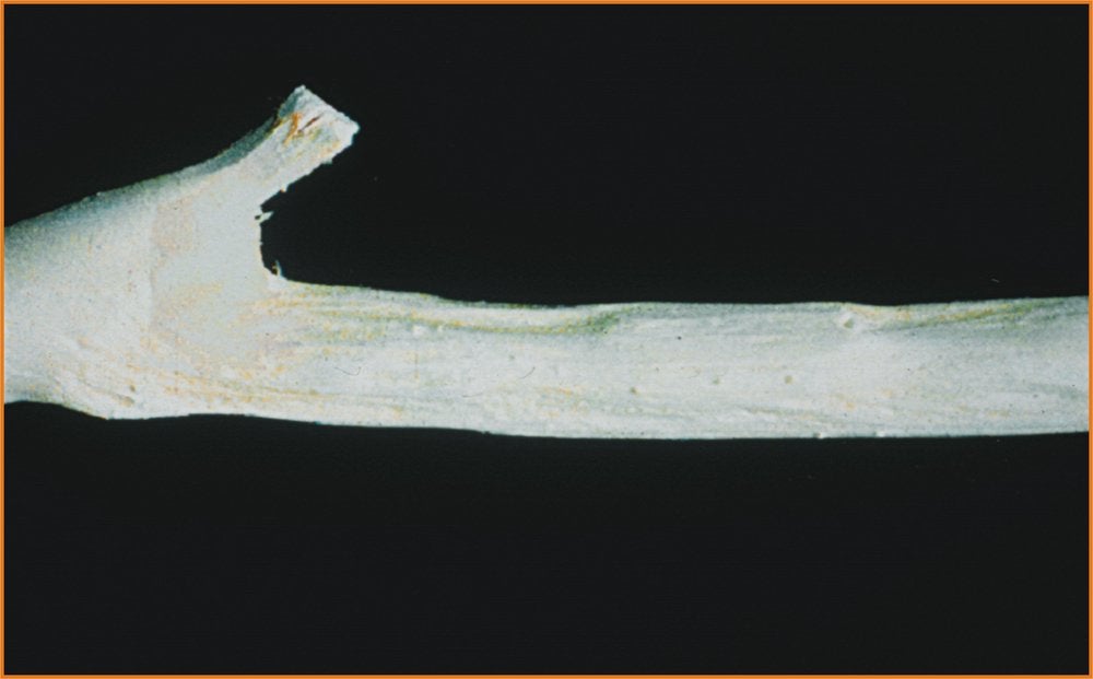 Bud union crease of a propagation of Nagami kumquat infected with CLBV on Troyer citrange rootstock (A). Brittle union of the infected plant (B). (Australia) – P. Barkley