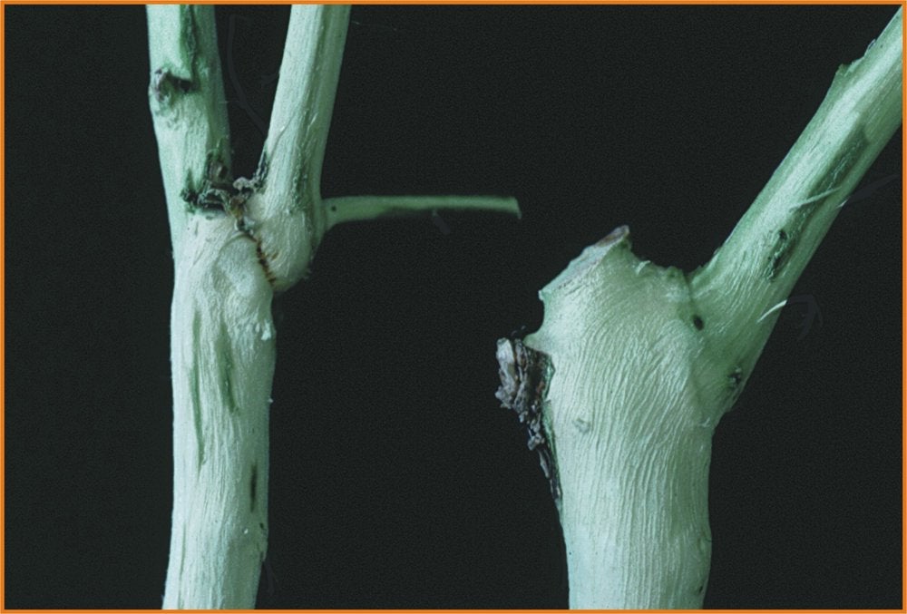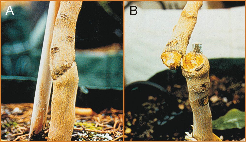 Bud union crease of a propagation of Nagami kumquat SRA-153 on Troyer citrange rootstock (left) compared with normal union of a healthy control plant (right). (Spain) – L. Galipienso