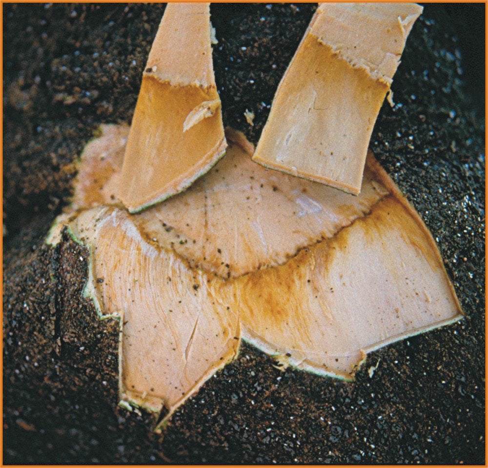 Bud union crease symptoms of a declining Roble sweet orange on citrumelo tree infected with CLBV: wood crack at the bud union line and crests in the inner bark corresponding with the wood crack. (Florida) – P. Moreno