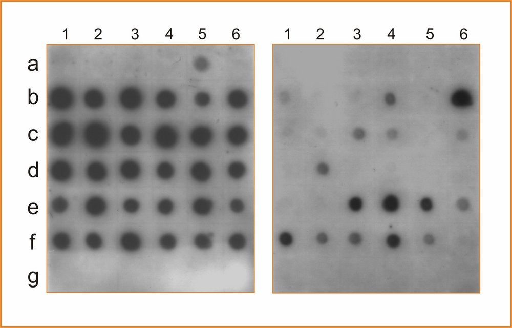 Detection of CLBV by dot blot hybridization using a probe of the RdRp region and total RNA extracts from young leaves (left panel) or old leaves (right panel) of the following citrus varieties: Pineapple sweet orange (a), Eureka lemon (b), Marsh grapefruit (c), Nules clementine (d), Navelina sweet orange (e) and Nagami kumquat infected with CLBV (f) or healthy (g). Numbers on the top correspond to different samples of the same plant (1–6). Nagami kumquat infected with CLBV isolate SRA-153 was used to graft inoculate the other citrus varieties. – M.C. Vives