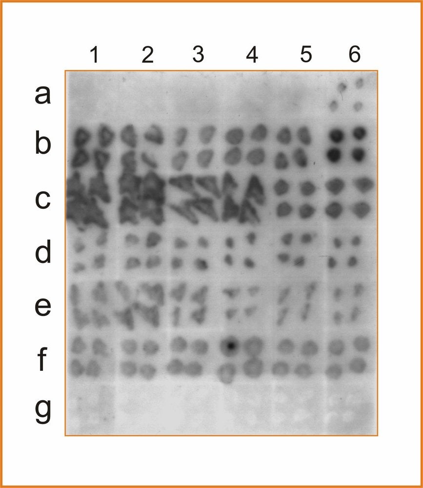 Tissue print hybridization of the RdRp probe with imprints of young shoots from Pineapple sweet orange (a), Eureka lemon (b), Marsh grapefruit (c), Nules clementine (d), Navelina sweet orange (e) and Nagami kumquat infected with CLBV isolate SRA-153 (f) or healthy (g). Numbers on the top (1–6) correspond to different shoots. Nagami kumquat infected with CLBV isolate SRA-153 was used to graft inoculate the other citrus varieties. – M.C. Vives