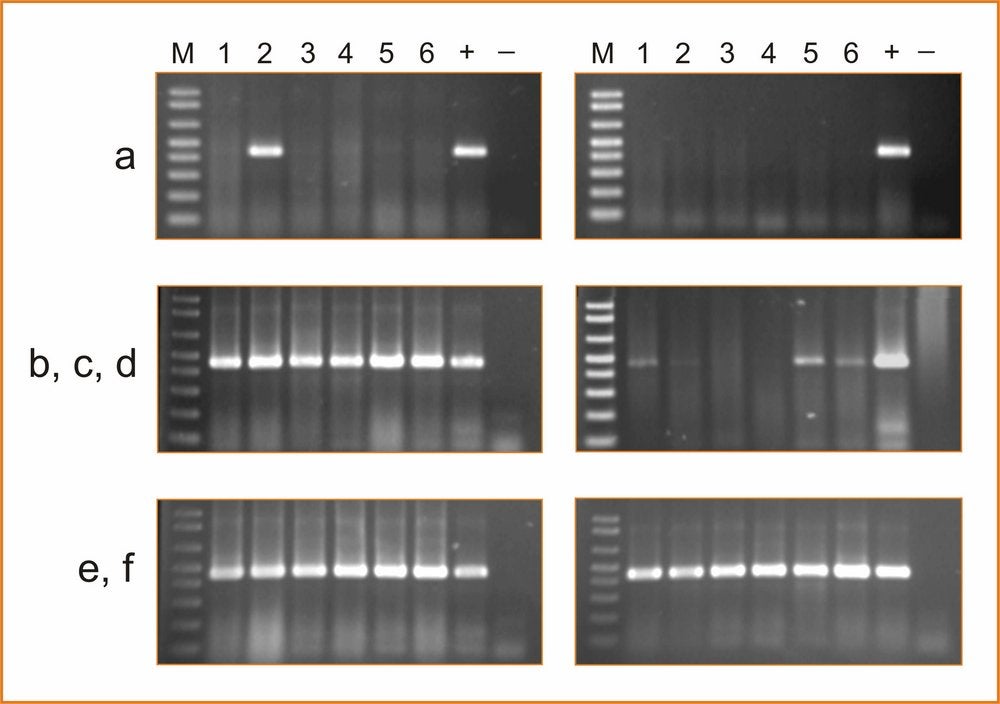 Detection of CLBV by RT–PCR with primers of RdRp region using total RNA extracts from young leaves (left panels) or old leaves (right panels) of the following citrus varieties: Pineapple sweet orange (a), Eureka lemon (b), Marsh grapefruit (c), Nules clementine (d), Navelina sweet orange (e) and Nagami kumquat infected with CLBV (f) or healthy (g). Numbers on the top correspond to different samples of the same plant (1–6). Nagami kumquat infected with CLBV isolate SRA-153 was used to graft inoculate the other citrus varieties, and was also included as positive (+) control for RT–PCR. Healthy kumquat was used as negative (−) control. – M.C. Vives