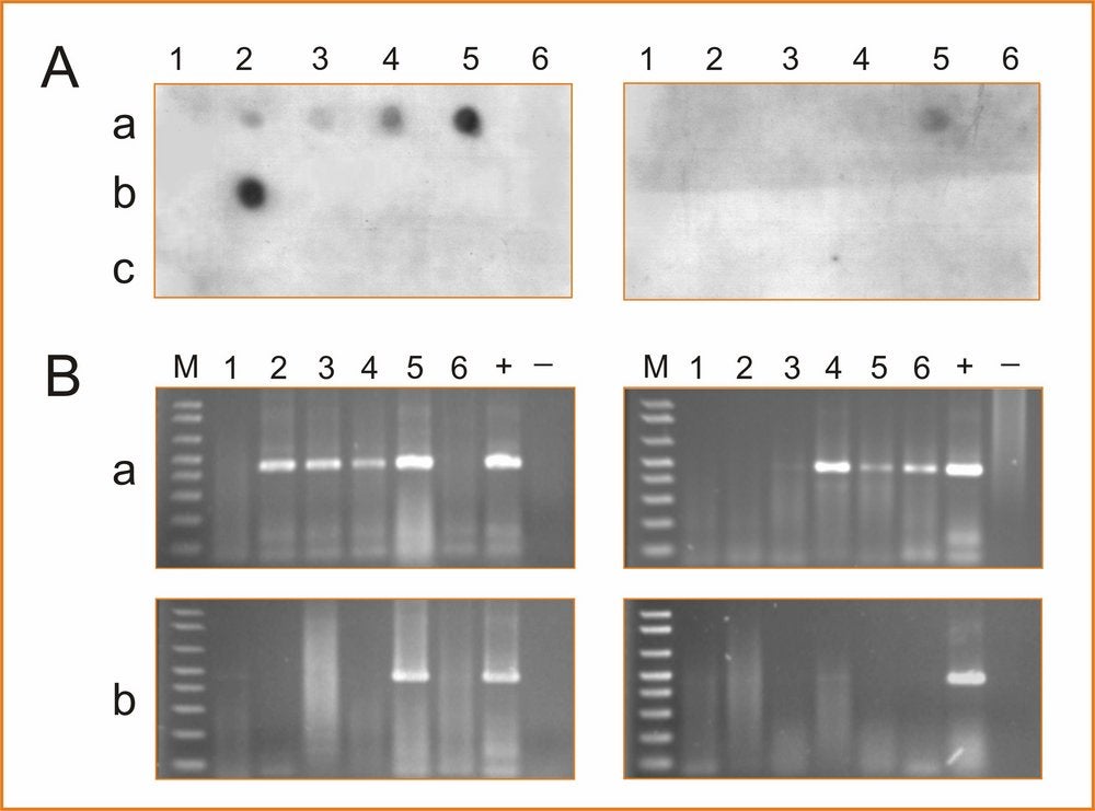 Detection of CLBV by dot blot hybridization (A) or RT–PCR (B) using total RNA extracts from young leaves (left panels) and old leaves (right panels) of two CLBV-infected Navelina sweet orange field trees (a, b) and a healthy greenhouse-grown Navelina plant (c). Numbers on the top (1–6) correspond to different samples of each plant. Nagami kumquat infected with CLBV isolate SRA-153 (+) and healthy kumquat (−) were used as positive and negative controls for RT–PCR. The probe and primers of RdRp region were used for DBH and RT–PCR, respectively.– M.C. Vives