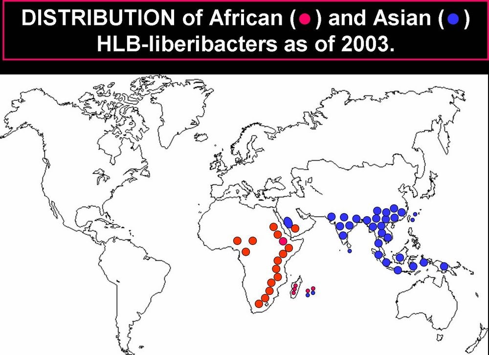Distribution. [See Bové (2006) for references on occurrence of HLB and HLB-vectors in certain countries]. Until 2003 (HLB. 003), HLB was restricted to two large geographical regions: Africa and Asia, with the Arabian Peninsula in between.