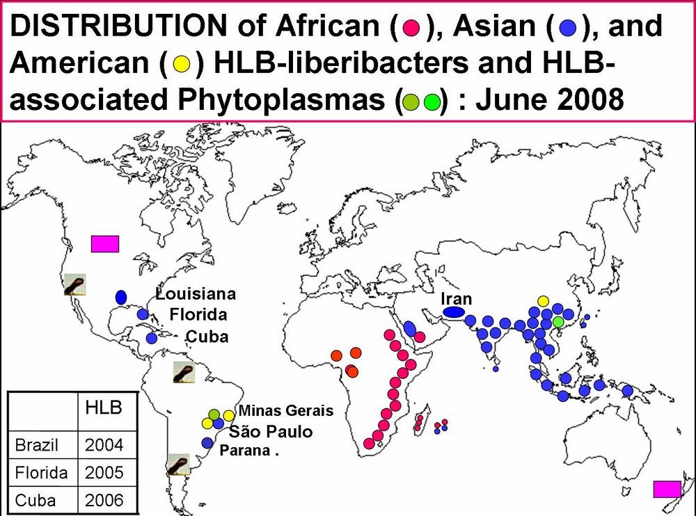 In America (HLB. 004), HLB has been recognized for the first time in the state of São Paulo (SSP), Brazil, in 2004 (Coletta-Filho et al., 2004;Teixeira et al., 2005a, b, c ,d, and e), next in 2005 in Florida, USA (Halbert, 2005), and in 2006 in Cuba (Luis Pantoja et al., 2008). In all three places, the disease was probably present, unrecognized, several years before it was reported. In Florida and Cuba, the HLB-associated liberibacter is of the Asian type. In SSP, two HLB-associated liberibacters are present, the Asian HLB bacterium and a new bacterium, the American liberibacter (Candidatus Liberibacter americanus). In 2004/2005, the American liberibacter was present in 95% of trees and the Asian liberibacter in about 5%. However, by 2008 the situation has reversed more trees being found infected with Ca. L. asiaticus than with Ca. L. americanus. This evolution might be related to the fact that Ca. L. asiaticus is heat tolerant, while Ca. L. americanus was found to be heat sensitive (Lopes et al., 2009b).The Asian psyllid vector was reported in SSP as early as 1942, but in Florida, only in 1998 and in Cuba in 1999. Lastly, HLB associated with Ca. L. asiaticus and D. citri has been identified in New Orleans (Louisiana, USA) in 2008.