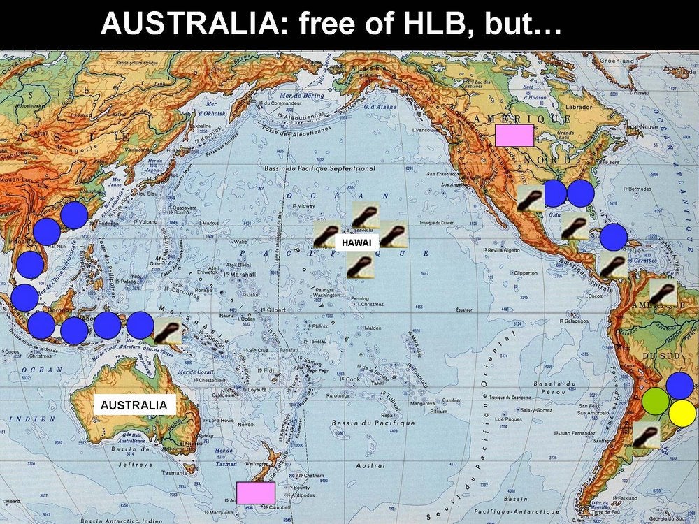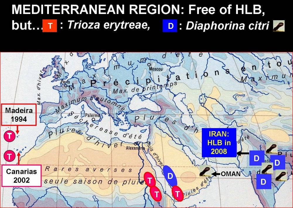 As of January 2009, the countries around the Mediterranean basin (HLB. 005), as well as Australia, New Zealand, and North- and South-Pacific islands (HLB. 006) are free of both HLB and HLB-psyllid vectors, except Hawaii and Maui islands, which carry D. citri.