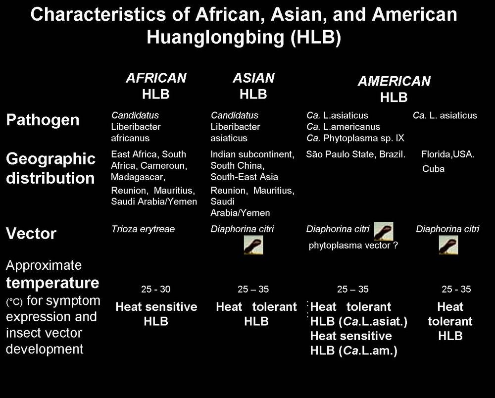 Table (HLB. 006b) summarizes the major characteristics of African, Asian, and American HLB.