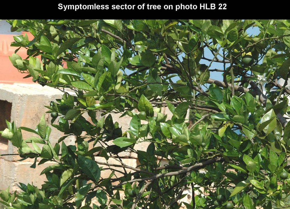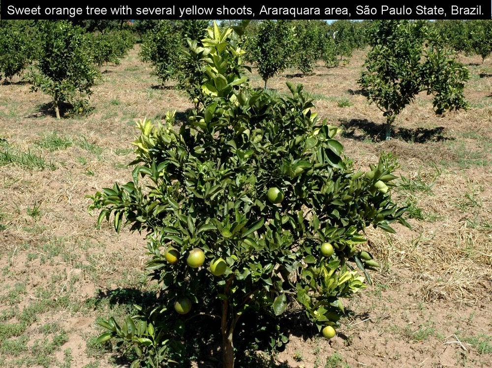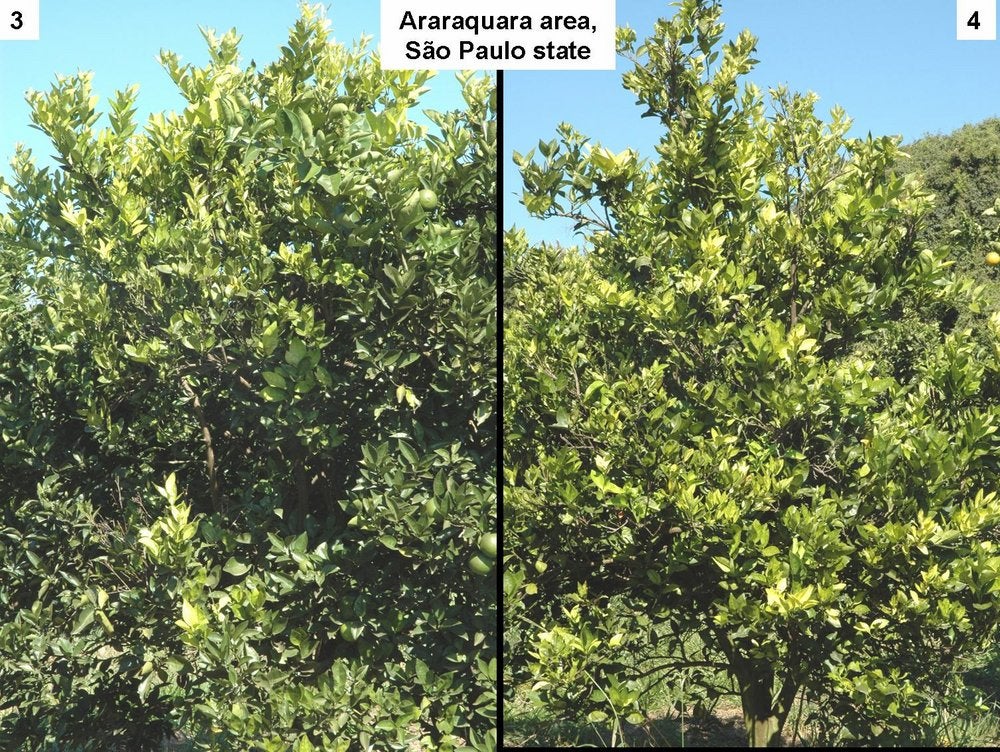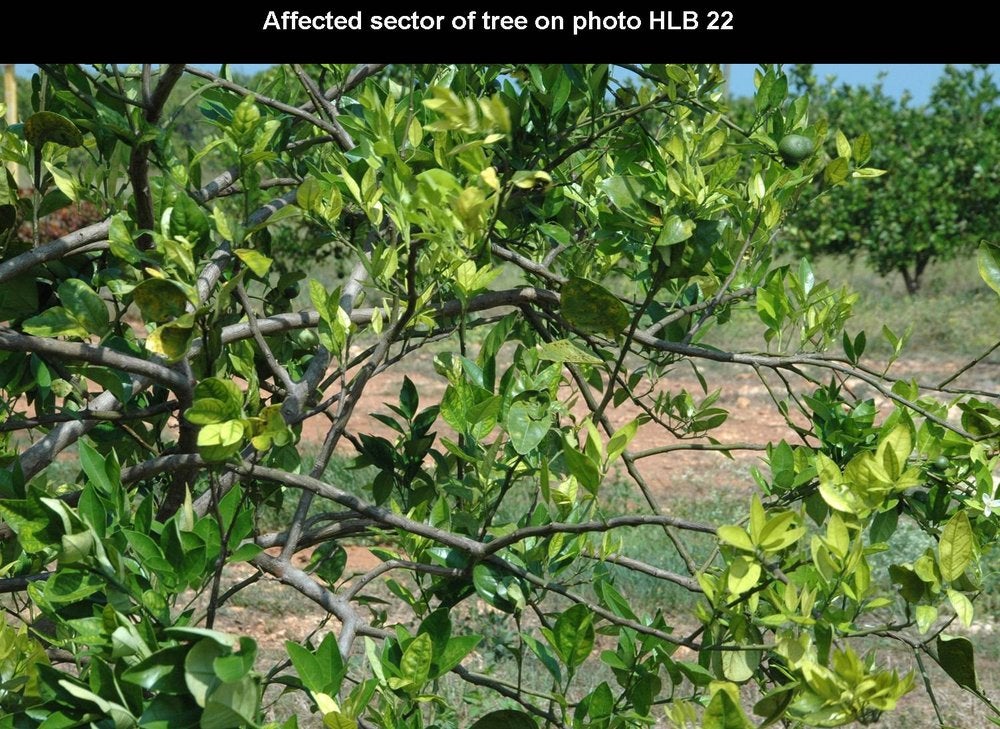 Sweet orange trees. In early stages of infection, affected trees are identified among symptomless trees by the presence of one (HLB. 009) or several characteristic “yellow shoots” (HLB. 010, 010b). With time, the yellow shoot grows into a larger yellow / pale green branch (HLB. 011). In South Africa, trees with large yellow branches are characteristic of HLB (HLB. 012) in comparison with symptomless trees (HLB. 013). In later stages of disease, the yellow branches take over the whole canopy, the tree is now fully (systemically) infected, and symptomatic all over (HLB. 014). In Sao Paulo state, the evolution of HLB from infected symptomless trees to fully affected trees (HLB. 015, 016, 017) is faster than in South Africa, and the “yellow branch” stage is less characteristic. Yellow branches may show one or several of the following features: defoliation, twig dieback, fruit drop, presence of leaves with blotchy mottle (see below), mineral deficiency patterns (zinc in particular), or uniformly yellow. Leaves with foliar symptoms of zinc deficiency have in general an upright growth, making a close angle with the shoot on which they are attached. Defoliation results in sparse foliage and an “open” type of growth (HLB. 018, 019). In Brazil, Florida and Cuba, when HLB was in the stages of spreading, many young orchards, because of abundant growth flushes, became affected more severely than old orchards with lesser flushes. While many trees in these orchards were fully affected (HLB. 019), other trees had still some symptomless sectors with well developed green leaves, while the symptomatic sectors had yellowish leaves with severe zinc deficiency patterns (HLB. 020, 021, 022, 023, 024). Such trees, with symptomless sectors and symptomatic sectors, are most characteristic of orchards invaded by HLB. In fall and early winter, these trees have blotchy mottle leaves, which may however drop in late winter and make HLB diagnosis less obvious.