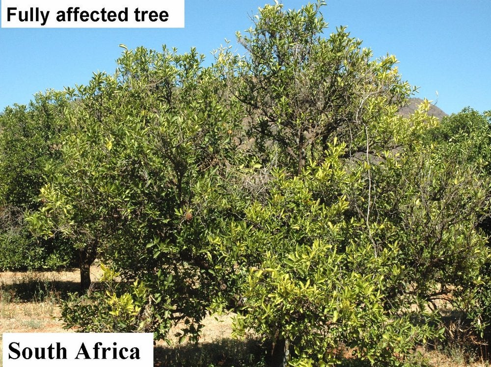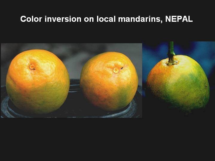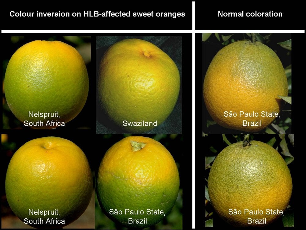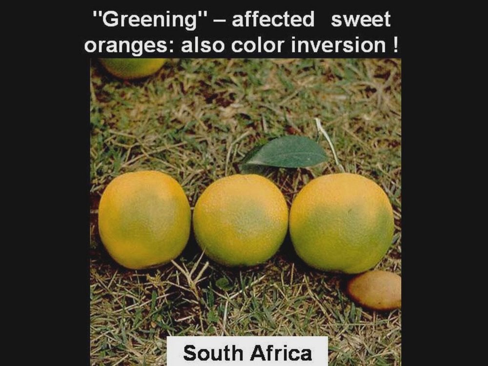 Symptoms shown by “Greening-affected” sweet oranges from South Africa are often due to colour inversion (South Africa) – J. M. Bové |