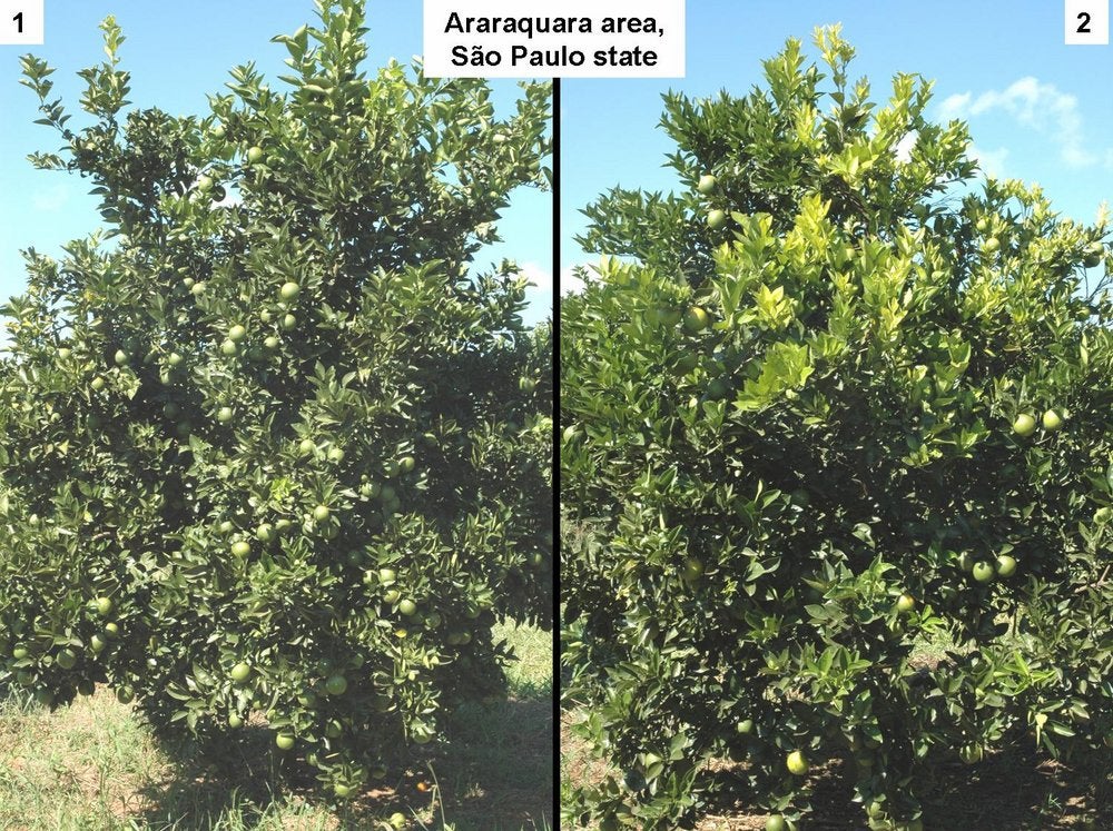 Normal sweet orange (left) and sweet orange affected by HLB-induced “colour inversion” (right) (São Paulo State, Brazil) – J. M. Bové |