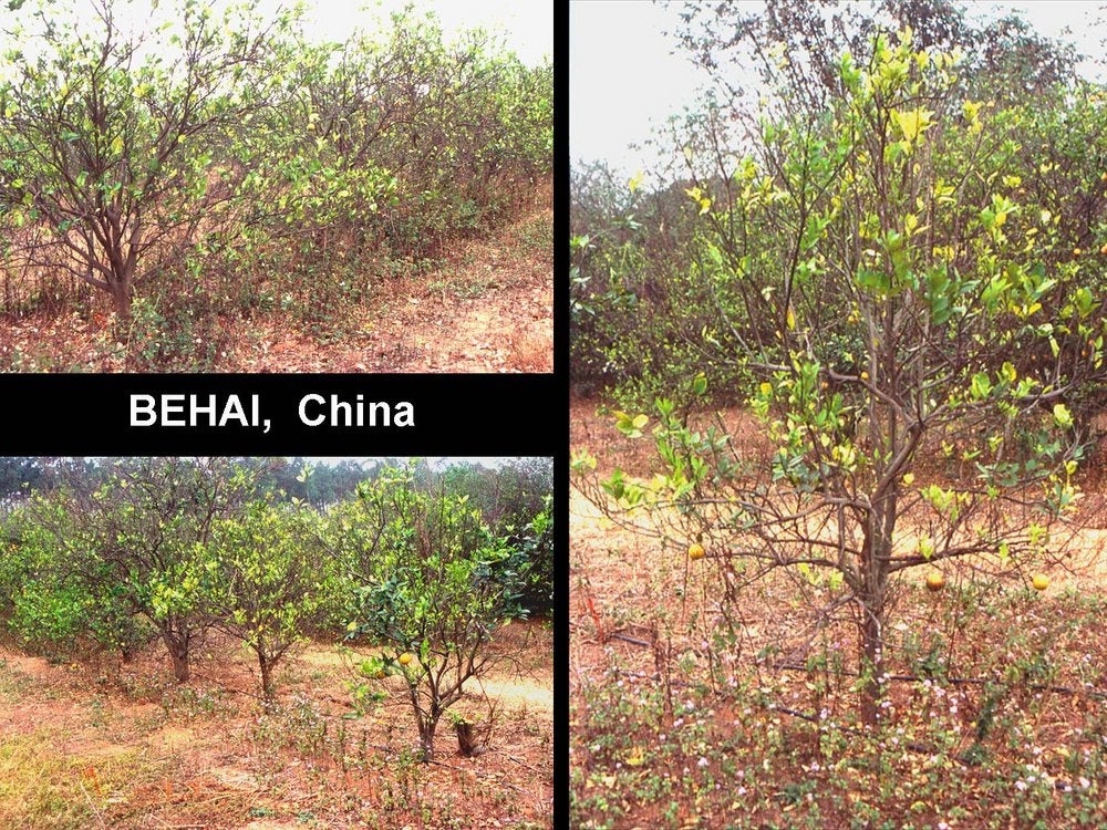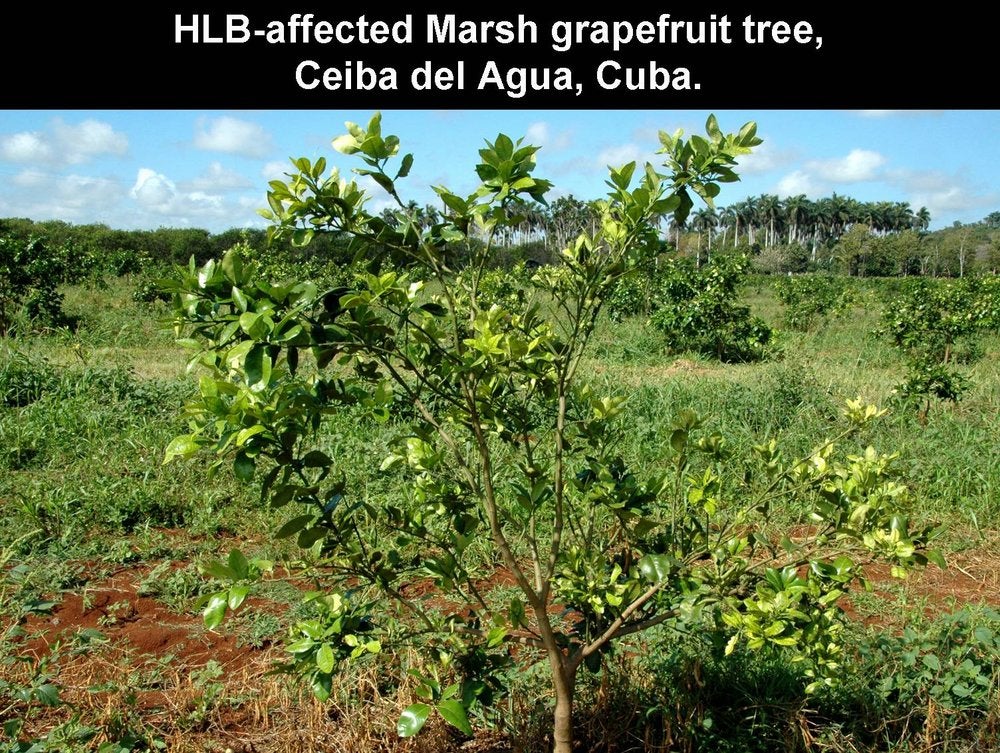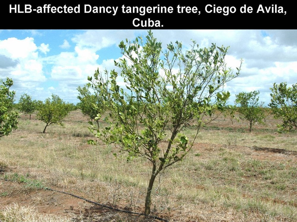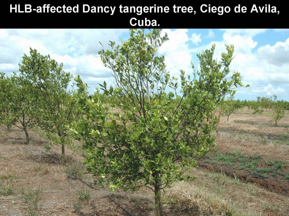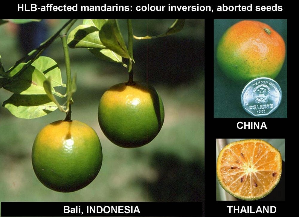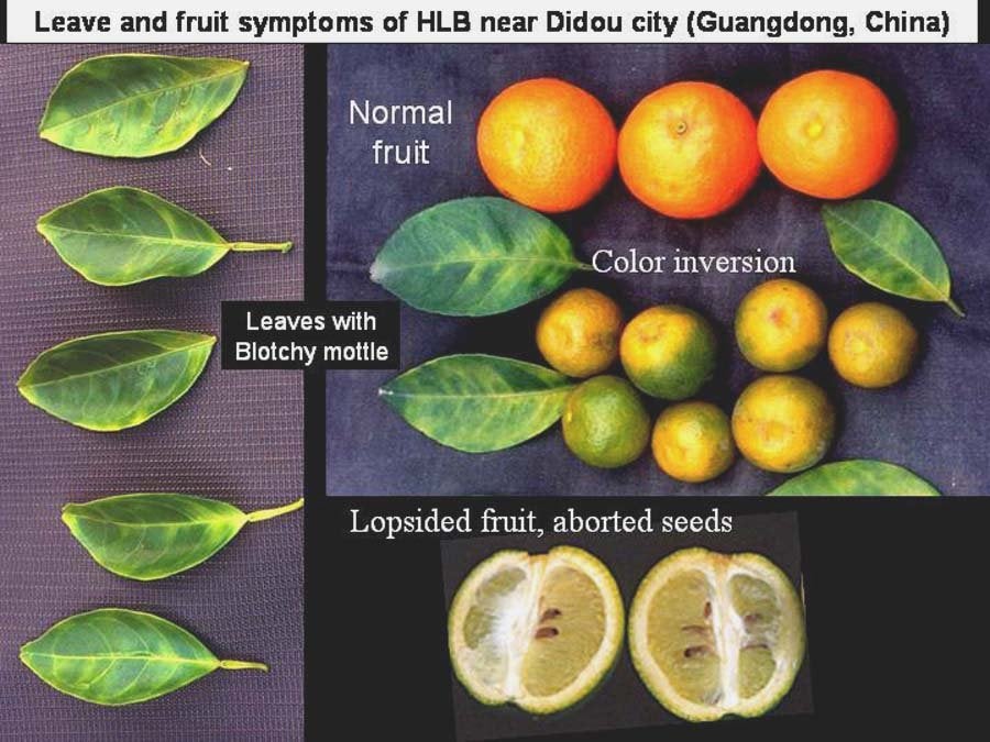 HLB is especially destructive on sweet orange, mandarin, tangelo and grapefruit trees, irrespective of rootstocks, whether the trees are grafted or are seedling trees. The crop on affected trees is not only reduced considerably by continuous fruit drop, dieback and tree stunting, but also by the very poor quality of fruits that remain on the trees.