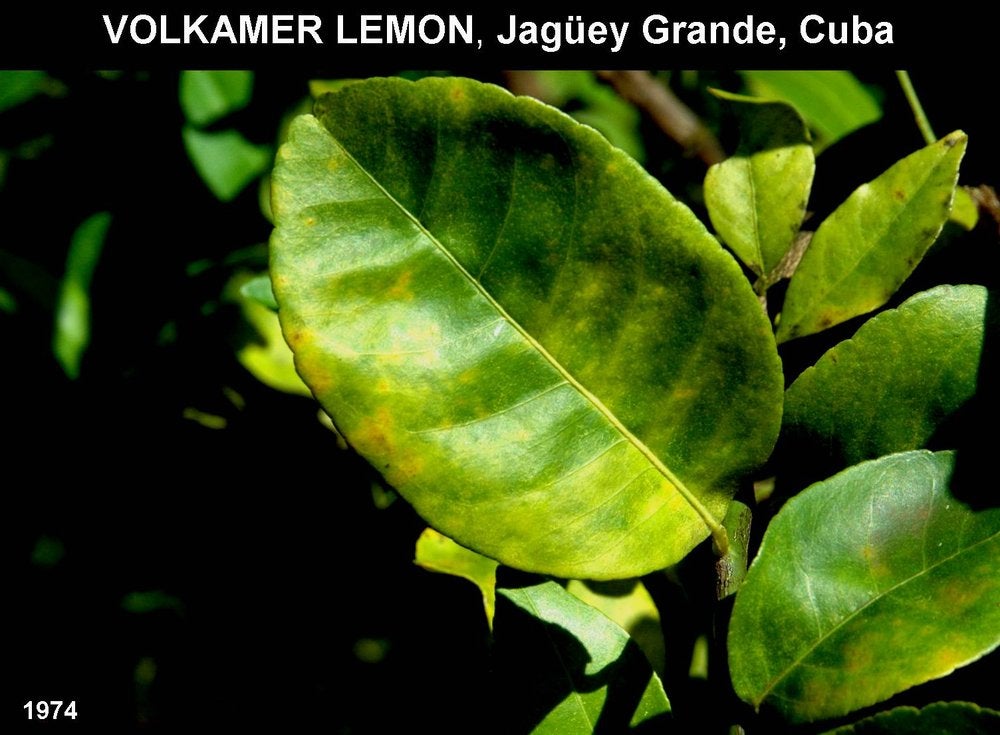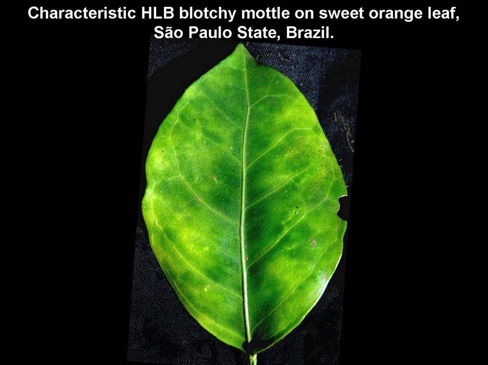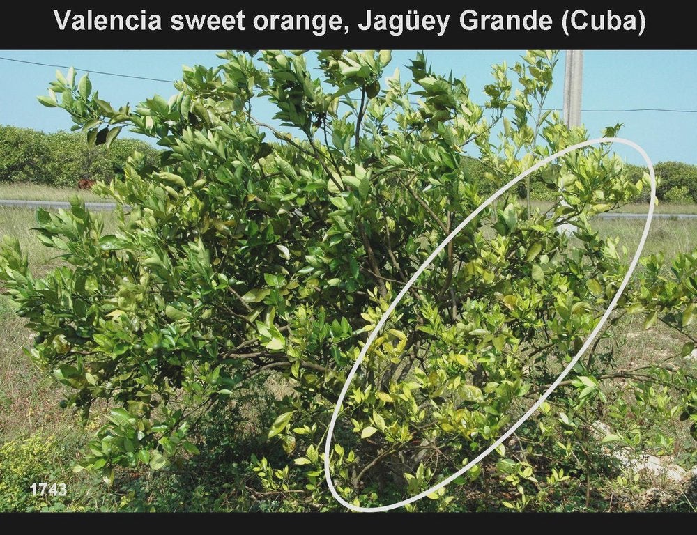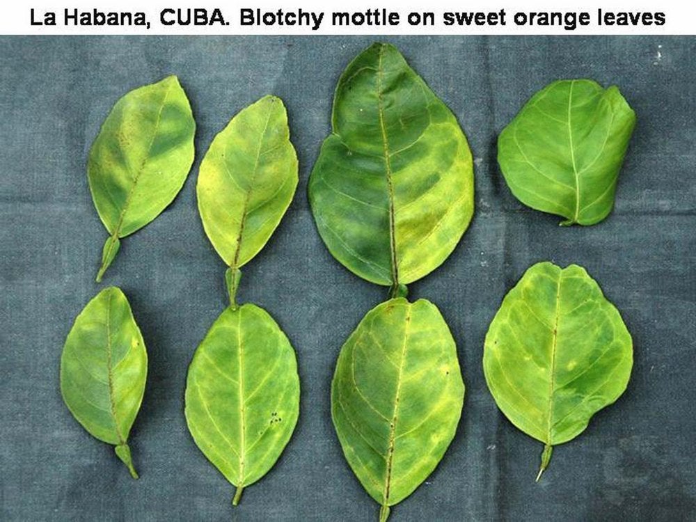 Sweet orange leaves with blotchy mottle in La Habana, Cuba – J. M. Bové |