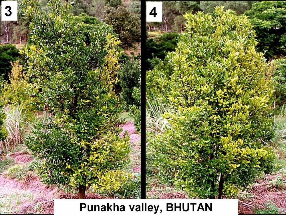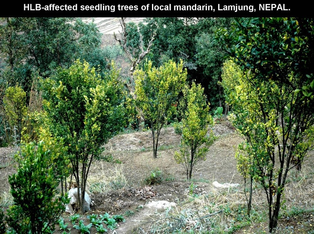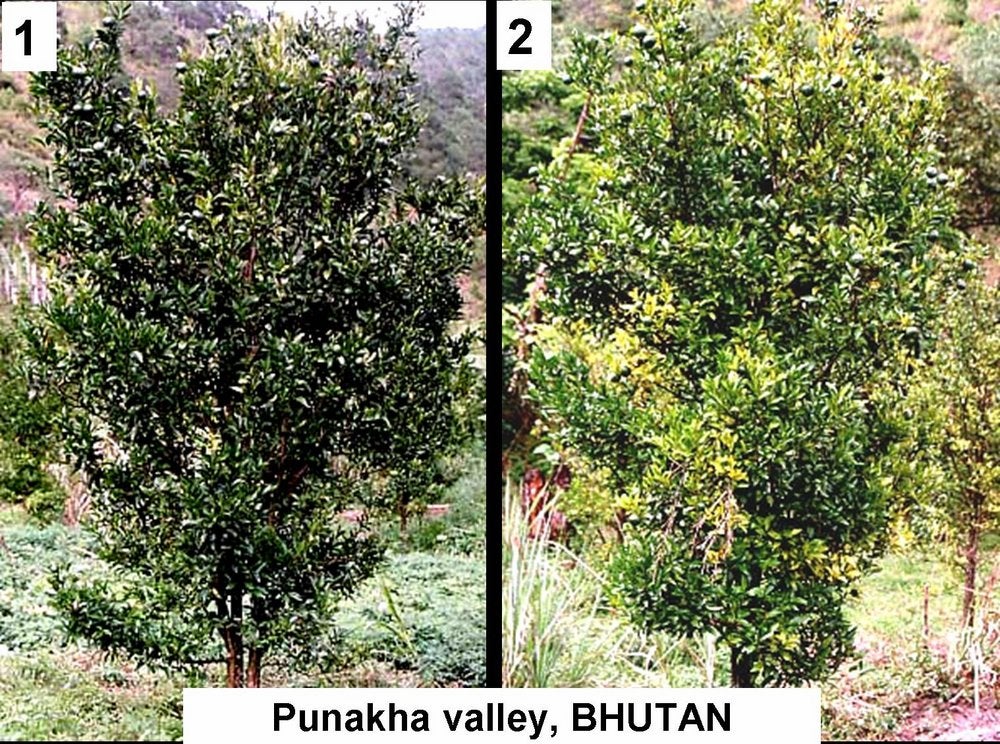 Mandarin and grapefruit trees. Nepal and Bhutan produce essentially local mandarins from seedling trees. Many orchards are severely affected by HLB as shown by photos (HLB. 025, 026, 027) for Nepal, and photos (HLB. 028, 029) for Bhutan. In Cuba, Dancy tangerine trees are also severely affected (HLB. 030, 031, 032). As the disease on mandarin trees progresses, more and more sectors turn yellow until no green leaves are left (HLB. 028, 029). Defoliation is severe (HLB. 027, 031, 032). In São Paulo State, HLB-affected Murcott tangor trees (HLB. 033) have pale green / yellowish branches, undergo defoliation and show severe fruit symptoms (see HLB. 098).