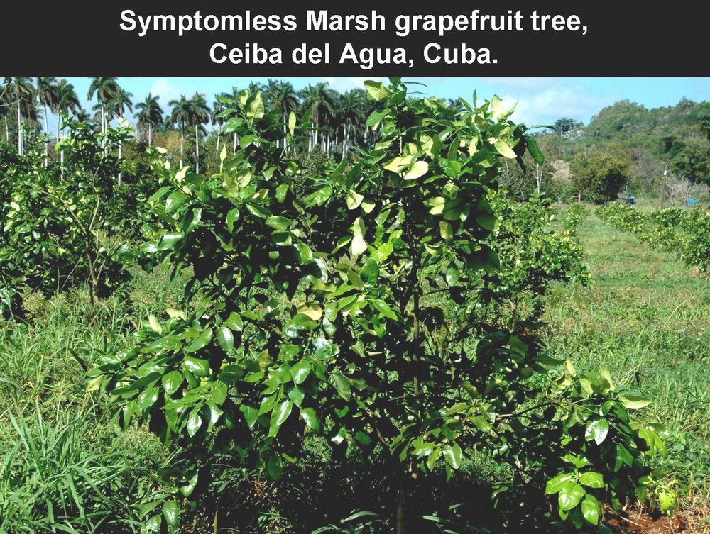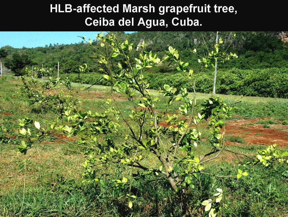 Photos (HLB. 034, 035, 036) show young grapefruit trees at various stages of affection in Cuba.