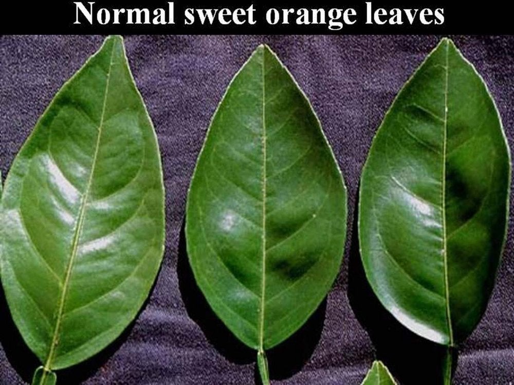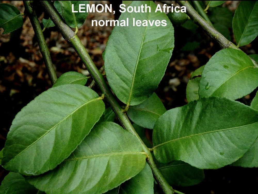 Normal, uniformly green lemon leaves (Nelspruit, South Africa) – J. M. Bové |
