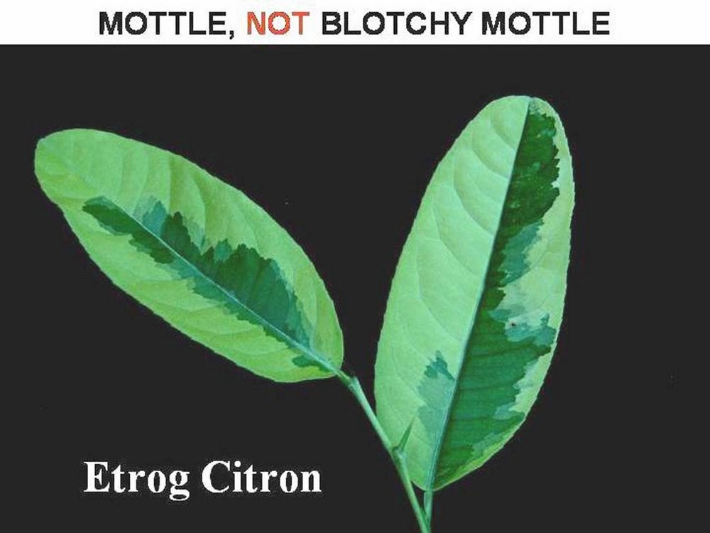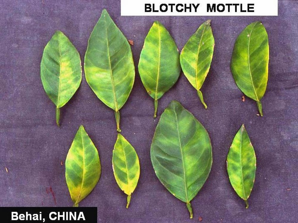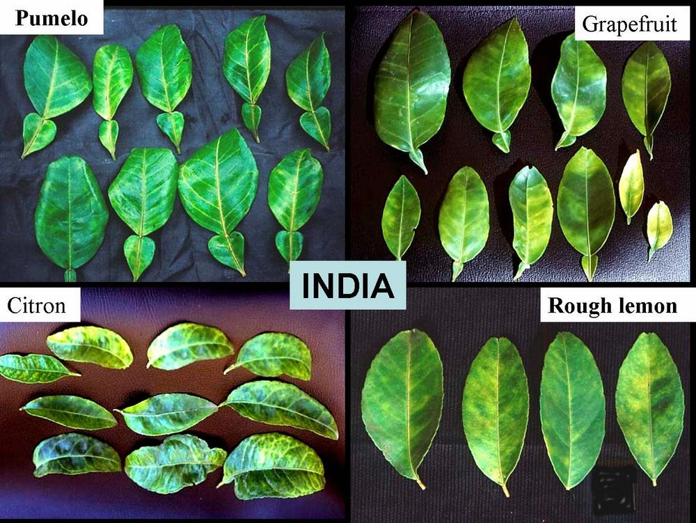 Blotchy mottle leaves from pumelo, grapefruit, citron, and Rough lemon trees (Puna, India) – J. M. Bové |