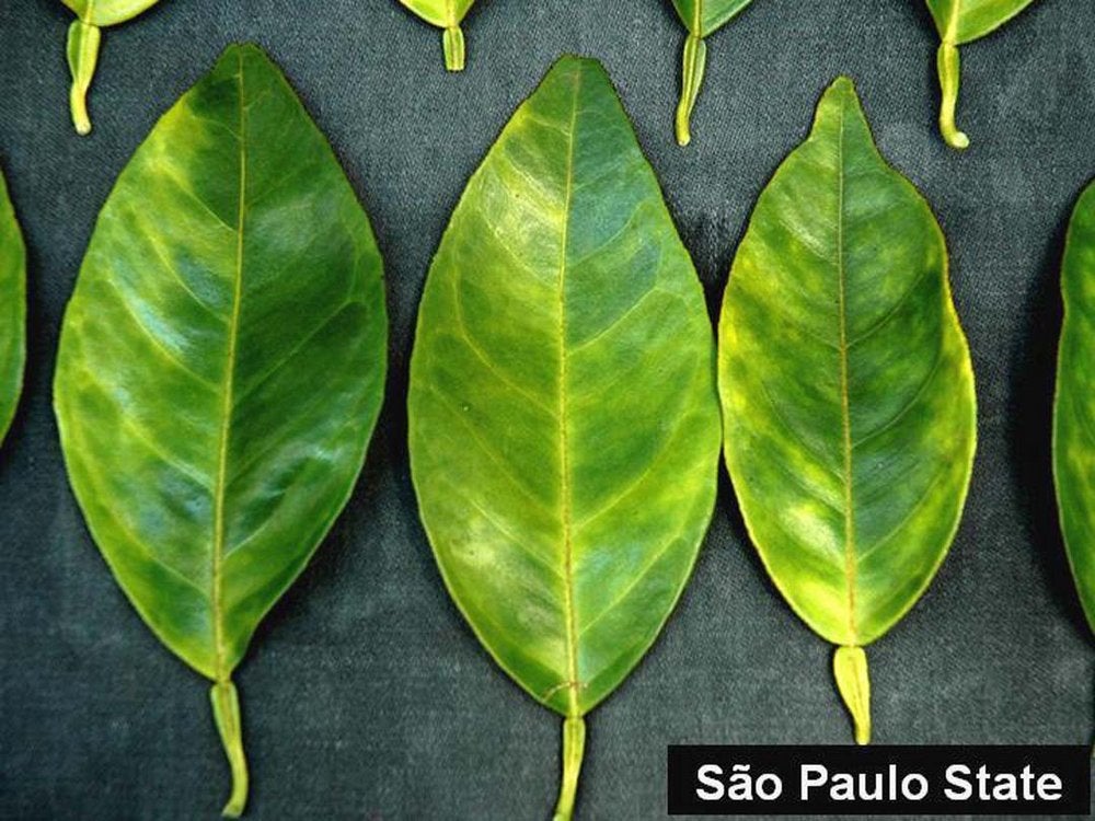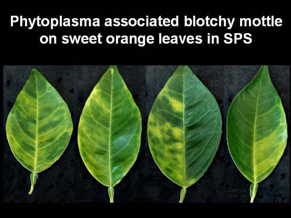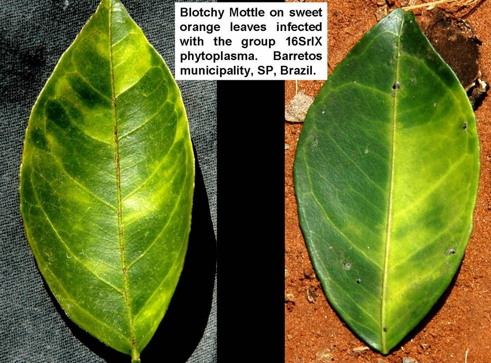 In addition to liberibacters, it has been found in São Paulo State, Brazil, and later in southern China, that phytoplasmas are also associated with HLB symptoms. The photo shows two leaves with characteristic HLB blotchy mottle symptoms associated with the 16Sr group IX phytoplasma (São Paulo State, Brazil) - D. C. Teixeira and J. M. Bové |