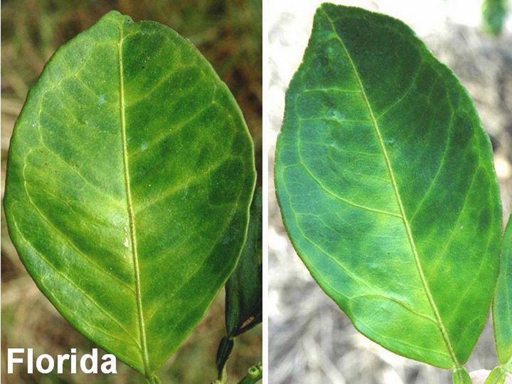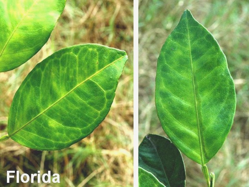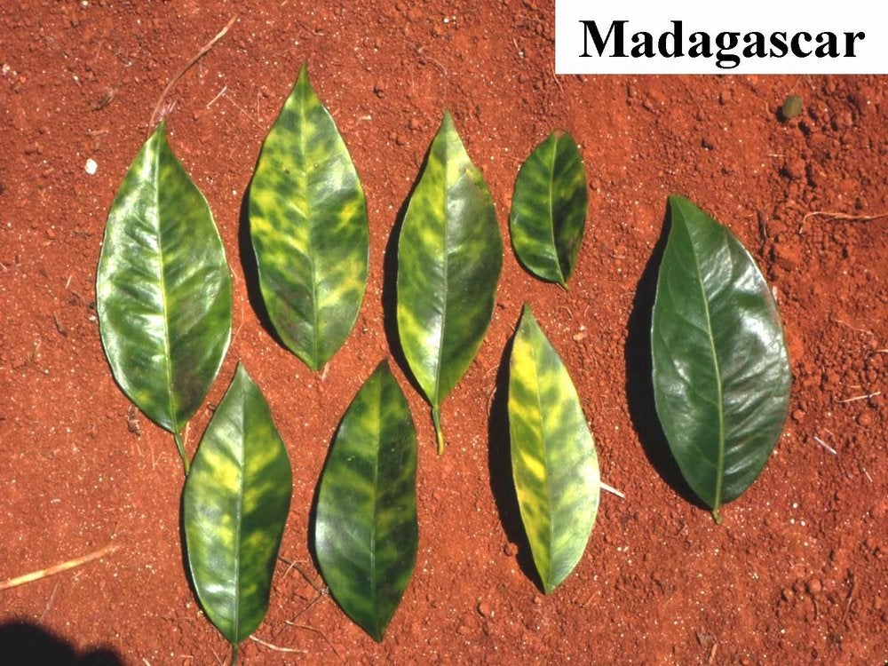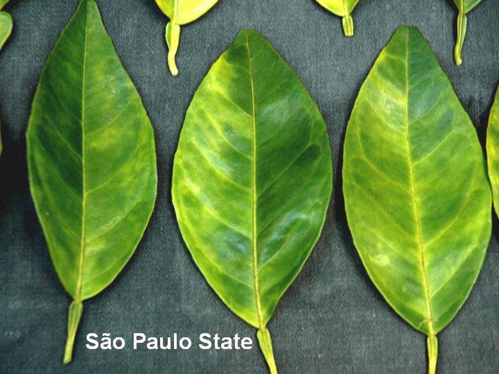 Right: normal sweet orange leaf. Left: several blotchy mottle leaves from HLB-affected sweet orange tree from Madagascar (altitude: ~1000m) – J. M. Bové |