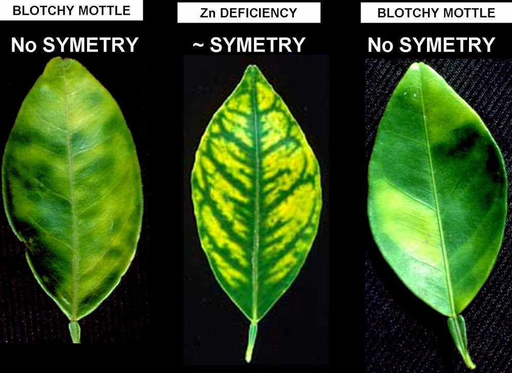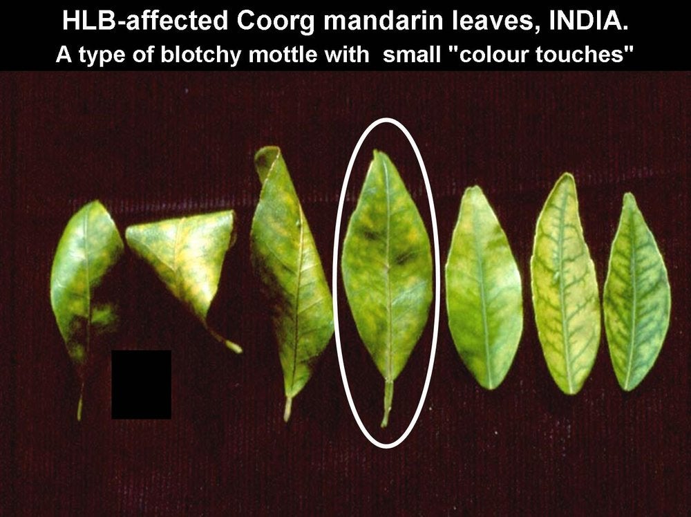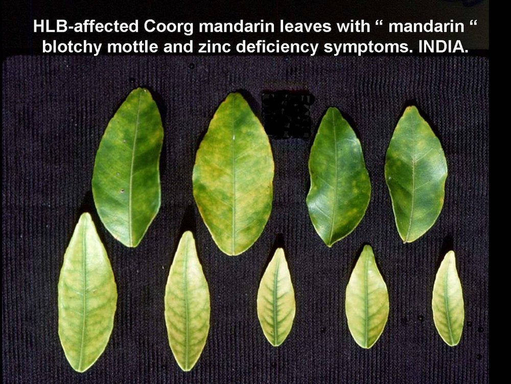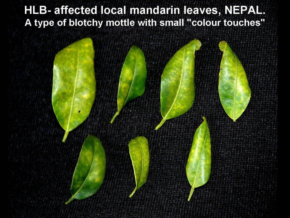 In certain situations, blotchy mottle is difficult to find. In 1996, in North Bali, Indonesia, HLB was severely affecting 4-year-old mandarin orchards. Most leaves were small and uniformly yellow. Some leaves had zinc deficiency symptoms, but clear-cut blotchy mottle was rare. PCR tests did however confirm HLB as the cause of decline of all the trees in these orchards. A similar situation was observed in Cuba in 2008.