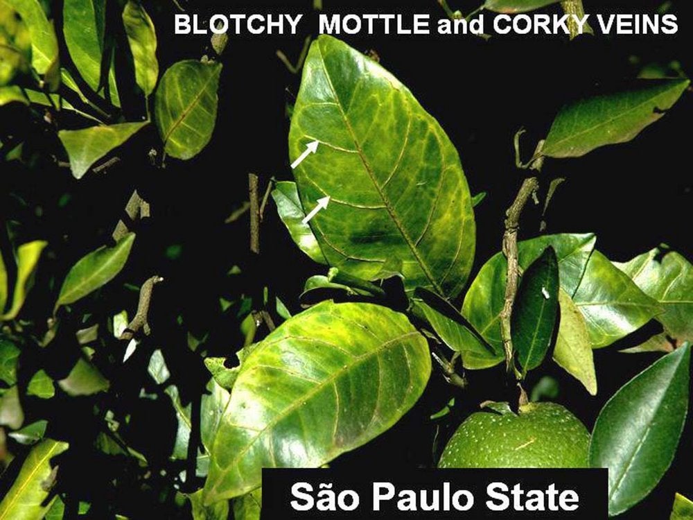 Sweet orange leaves with blotchy mottle showing in addition corky veins (white arrows) (São Paulo State, Brazil) – J. M. Bové |