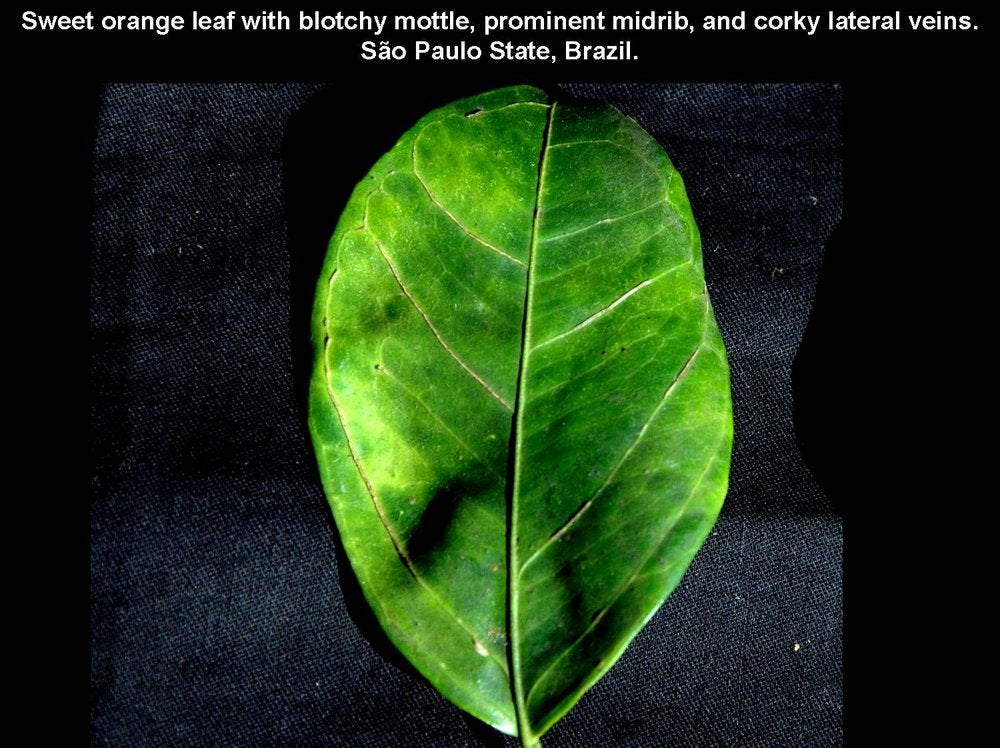 Sweet orange leaves with blotchy mottle, prominent midrib, and corky lateral veins (São Paulo State, Brazil) – J. M. Bové |