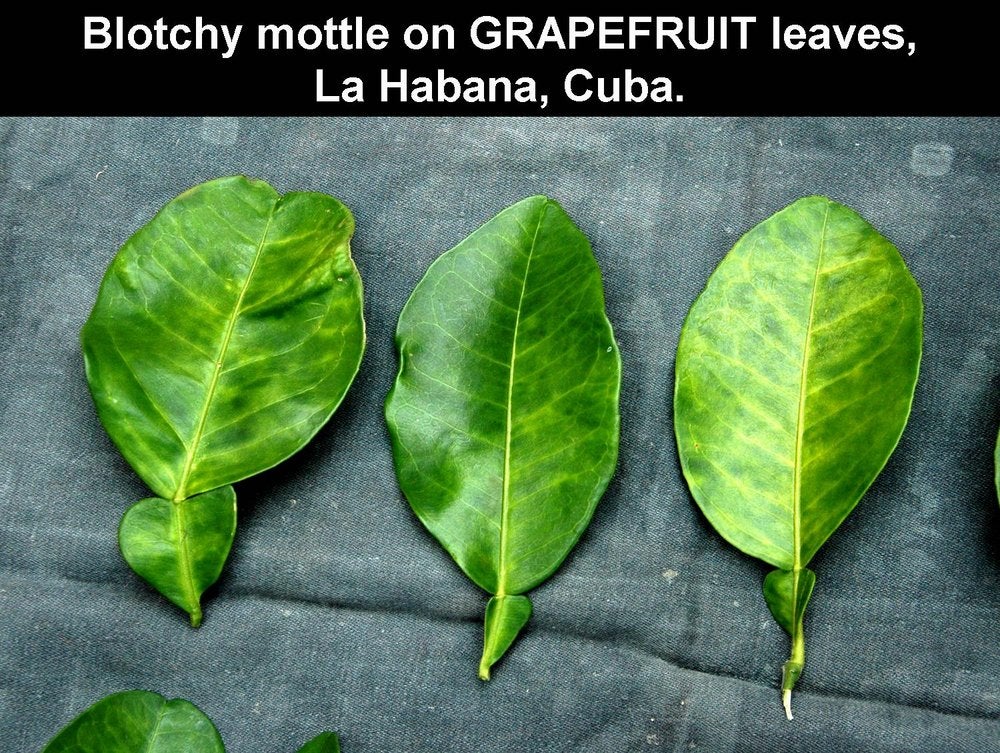 Blotchy mottle on grapefruit leaves from HLB-affected tree (La Habana, Cuba) – J. M. Bové |