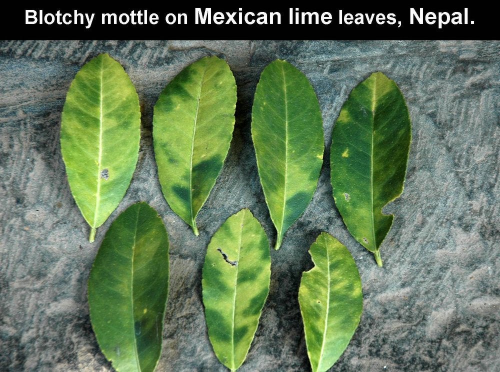 Lime (Citrus aurantifolia) leaves with blotchy mottle of the “lemon type”, characterized by large dark green patches (Patan, Nepal) – J. M. Bové |