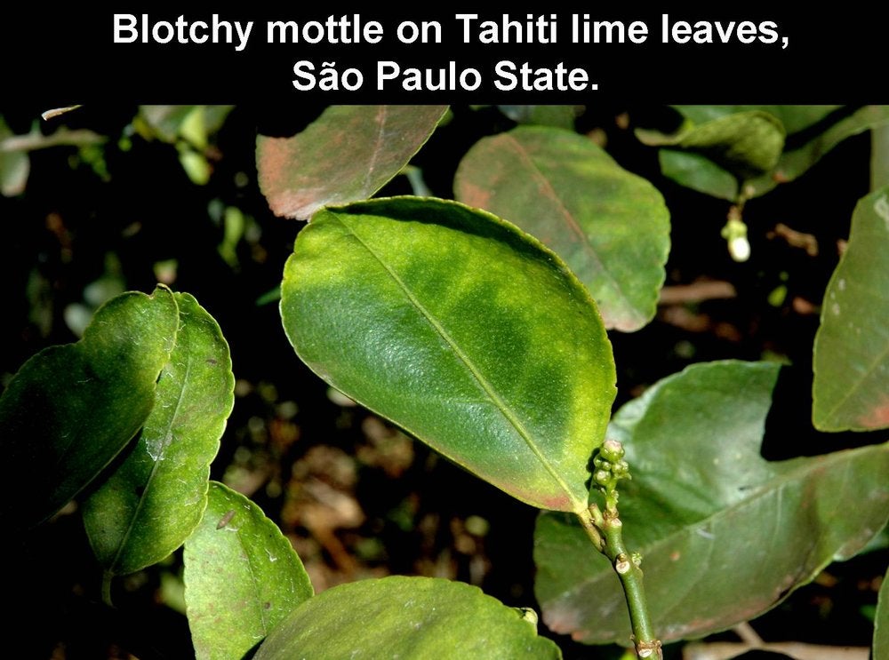 Most severe symptoms are found on sweet orange, mandarin, tangelo, and grapefruit, followed by lemon, rough lemon, and sour orange. Severe fruit and leaf symptoms can be seen on Pumelo (Citrus grandis), even though this species is sometimes considered erroneously more or less tolerant. Trees of small-fruited, acid lime (Citrus aurantifolia) are only slightly affected, but clear-cut blotchy mottle symptoms can be seen on leaves. In many countries where HLB occurs, citrus tristeza virus (CTV) is also present and affects acid lime much more severely than does HLB. However, the lime trees are severely affected by the Asian HLB vector, D. citri, a real pest for lime trees (HLB. 115).