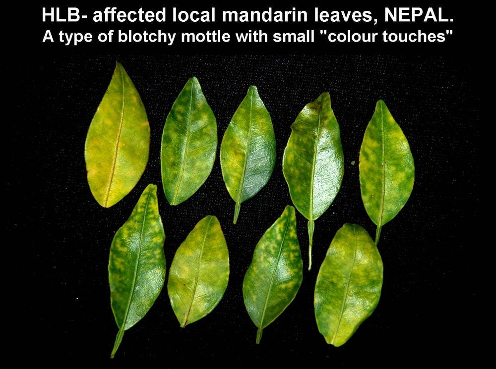 Shoot with blotchy mottle leaves from HLB-affected seedling tree of local sweet orange variety (Dhankuta, Nepal) – J. M. Bové |