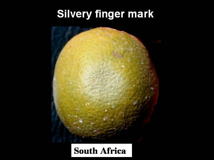 Pressing with the thumb a sweet orange affected by “greening”, i.e. colour inversion, induces a silvery “finger mark”. Frequently observed in South Africa, it is also seen in São Paulo State, Brazil – J. M. Bové |