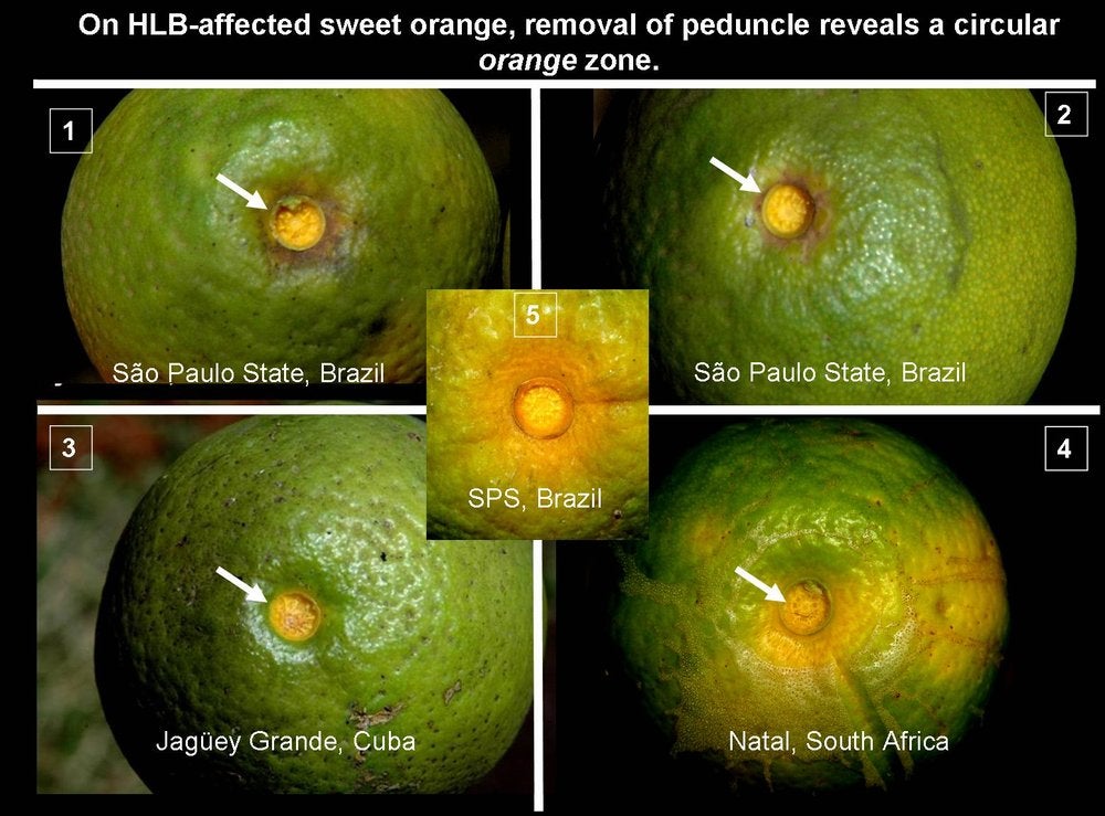 When fruits are still green, removing the peduncle of a sweet orange reveals the circular, peduncle-insertion zone. This zone is stained orange on HLB-affected fruit as shown on this photo, while the equivalent zone on normal fruit is pale-green, as shown on photo HLB. 089. The orange coloration seen at the pedoncular half of the fruit as the result of colour inversion, actually starts at the circular, peduncle-insertion zone, and can be seen only by removing the peduncle (fruits 1, 2, and 3). Later, the orange coloration extends out of this zone and begins to affect the fruit around the peduncle (fruits 4 and 5) (Brazil, Cuba, South Africa) – J. M. Bové |