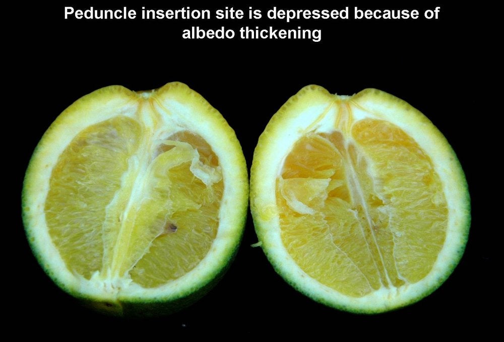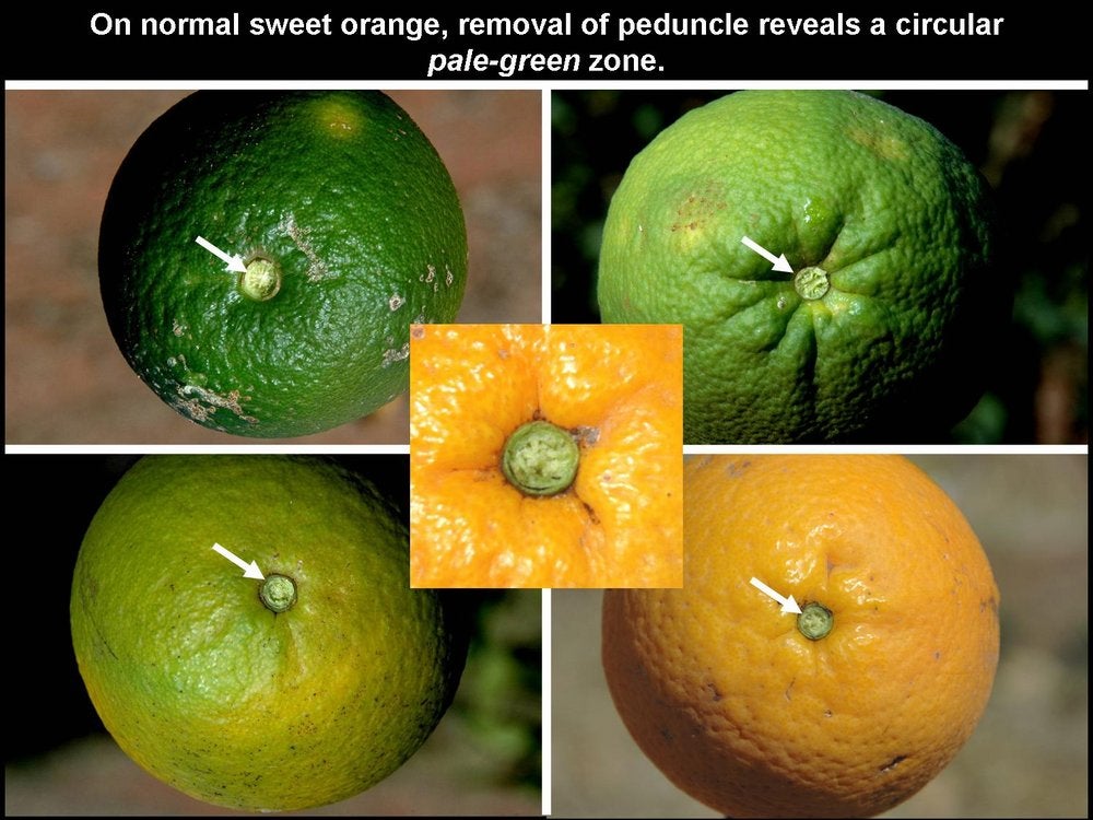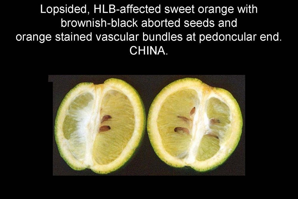 Sweet orange. In addition to blotchy mottle on leaves, HLB has also characteristic symptoms on fruit, easily seen on sweet oranges. On normal fruit, when fruit ripens and changes colour, the orange colour develops first at the stylar end, at a time when the peduncular end is still green (HLB. 084, 085). On HLB-affected fruit, there is colour inversion: the orange colour starts first at the peduncular end, at a time when the stylar end is still green (HLB. 084, 085). The “greening” aspect of HLB-affected fruit in South Africa is often due to colour inversion (HLB. 086), and when one presses such fruit with the thumb, a silvery greyish “finger-mark” appears on the rind surface (HLB. 087). Removing the peduncle from a totally green fruit reveals a depressed, circular zone, which is stained bright orange on HLB-affected fruit (HLB. 0881, 2, 3), and pale green on normal fruit (HLB. 089). Such an orange-stained peduncular scar is the first indication of color inversion; from there, coloration extends to the peduncular half of the fruit, down to the stylar end (HLB. 088 4, 5). On slide (HLB. 090), the fruit in the middle has been cut perpendicularly to the fruit axis, a few millimetres below the circular orange zone shown on the upper fruit; this section reveals the orange stained zone of the vascular bundles in the albedo. These vascular bundles are also visualized on the cross-section of the fruit in the lower part of the slide. Such cross-sections through the fruit axis are particularly useful to observe not only (i) the orange-stained vascular bundles in the peduncular half of the fruit axis (HLB. 090, 091, 093), but also (ii) the presence of aborted seeds .(HLB. 090, 091, 093), and (iii) the asymmetry or lopsidedness of the fruit (HLB. 091). Lopsided fruits are characteristic of HLB, and their size is smaller than that of normal fruits (HLB. 092). Small fruits with aborted seeds are also highly characteristic of HLB (HLB. 092). On HLB-affected fruit, the peduncle insertion point is often depressed because of the thickening of the albedo in the peduncular region (HLB. 093). Finally, HLB-affected trees are characterized by heavy fruit drop (HLB. 094, 095).