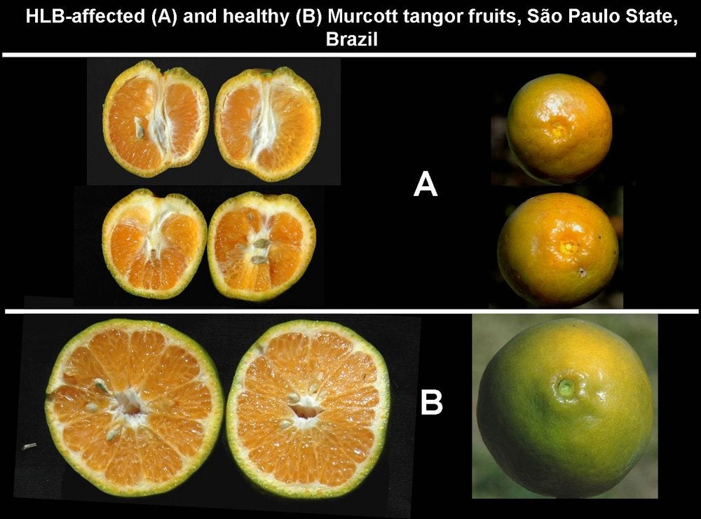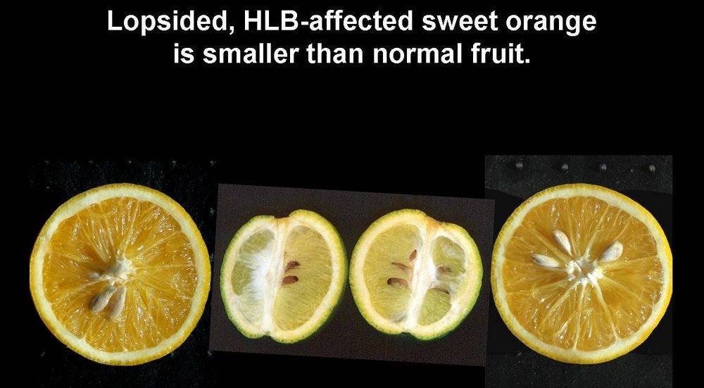 Lopsided, HLB-affected sweet oranges are smaller than normal oranges (China) – J. M. Bové |