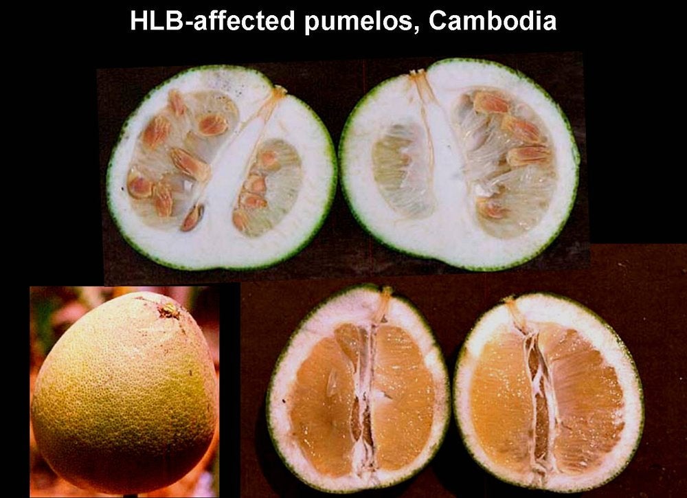 HLB-affected pumelos: small size, lopsidedness, aborted seeds, orange-stained vascular bundles at pedoncular fruit axis (Cambodia) – J. M. Bové |