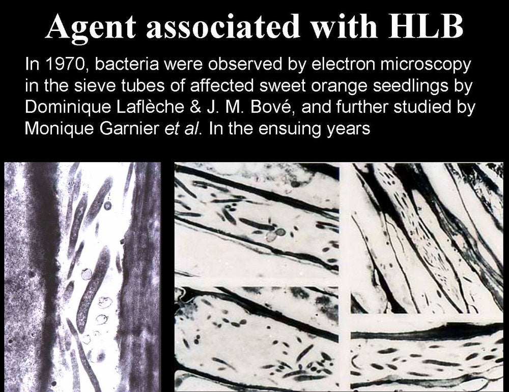 Electron micrographs by Dominique Laflèche and J. M. Bové (1970) showing the presence of bacteria in the sieve tubes of HLB-affected, sweet orange seedlings graft-inoculated with infected citrus tissues from South Africa, Reunion island and India (Versailles, France) – D. Laflèche and J. M. Bové |
