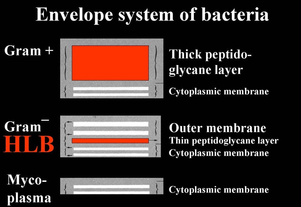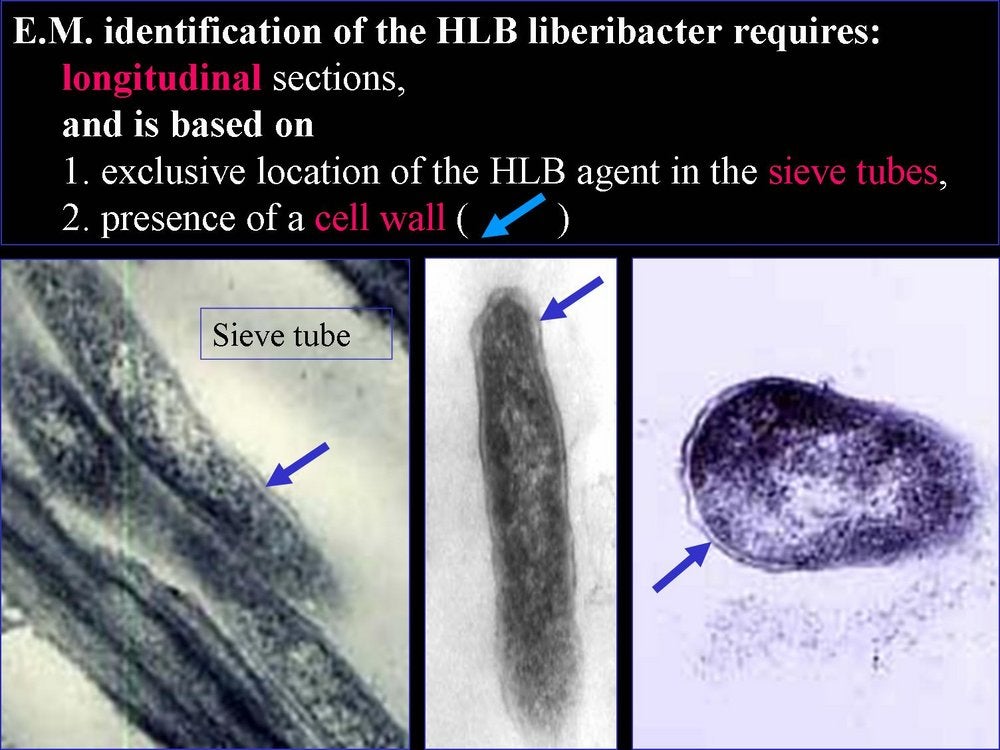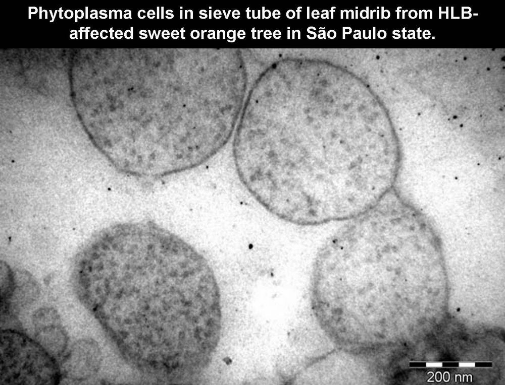 Phytoplasmas (Plant mycoplasmas) are wall-less bacteria (Mollicutes) (HLB. 101, 127), and can be easily distinguished from the walled liberibacters (HLB. 101, 102, 103, 126) by electron microscopy.