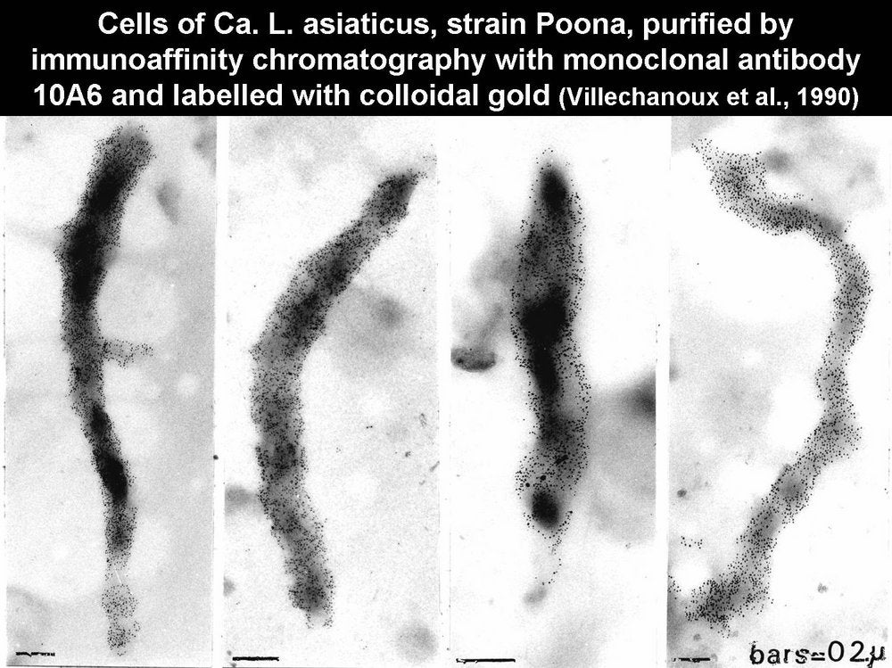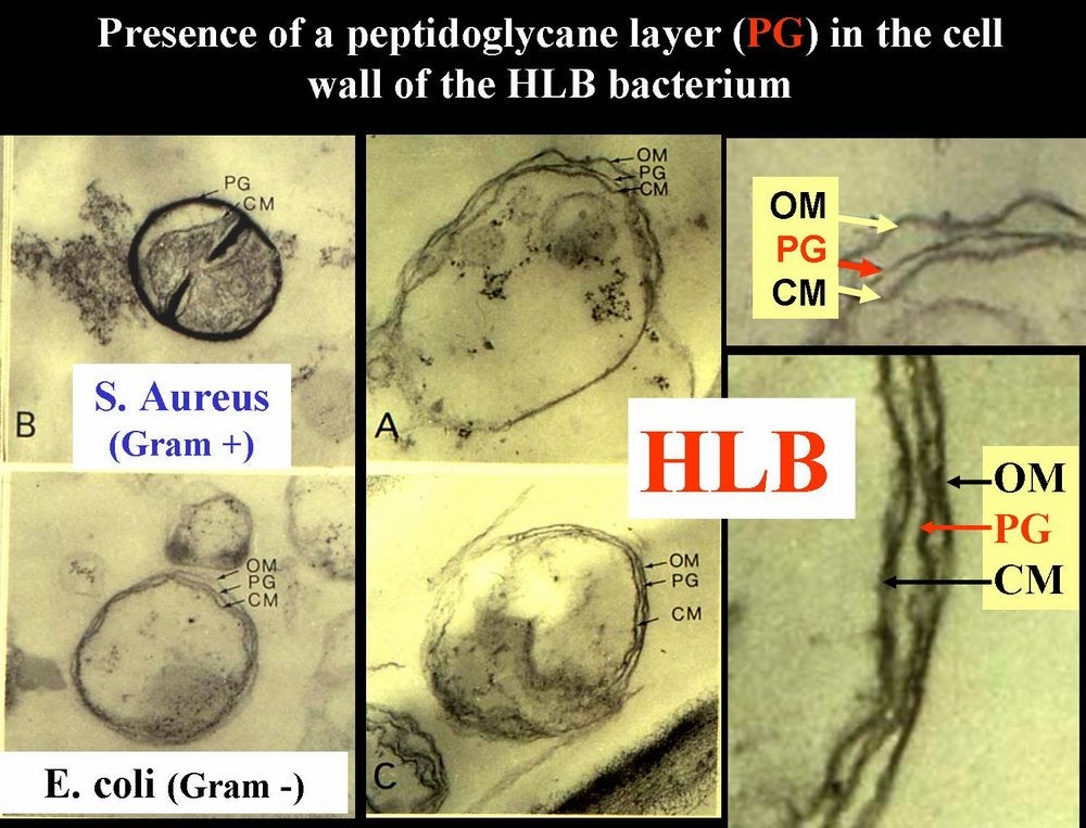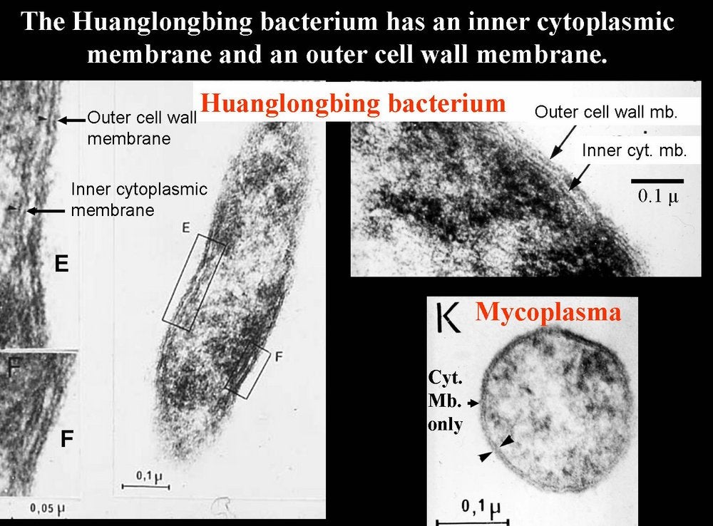 Electron micrographs by Monique Garnier and J. M. Bové (1977) showing that the bacterium associated with HLB has a triple- layered cytoplasmic membrane as well as a triple-layered cell- wall membrane. Mycoplasmas lack cell-walls and are surrounded only by a cytoplasmic membrane (Bordeaux, France) - M. Garnier and J. M. Bové |