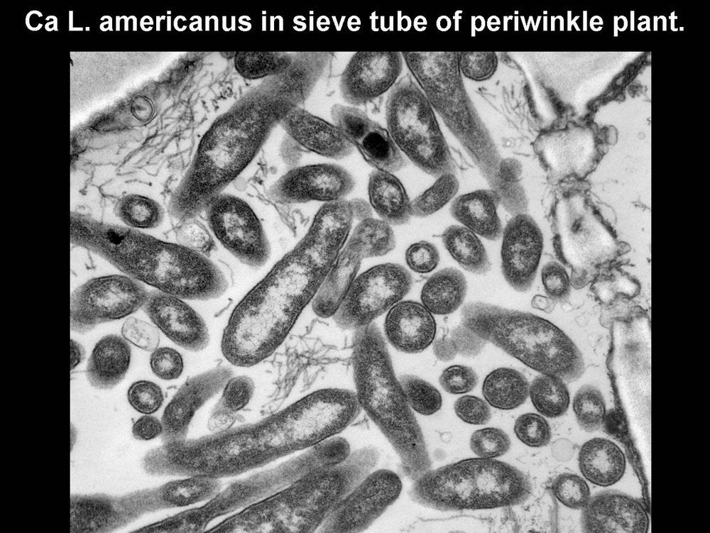 Electron micrograph of Candidatus Liberibacter americanus in a sieve tube of an experimental, HLB-affected periwinkle plant (Bordeaux, France) – B. Gelie and J. M. Bové |