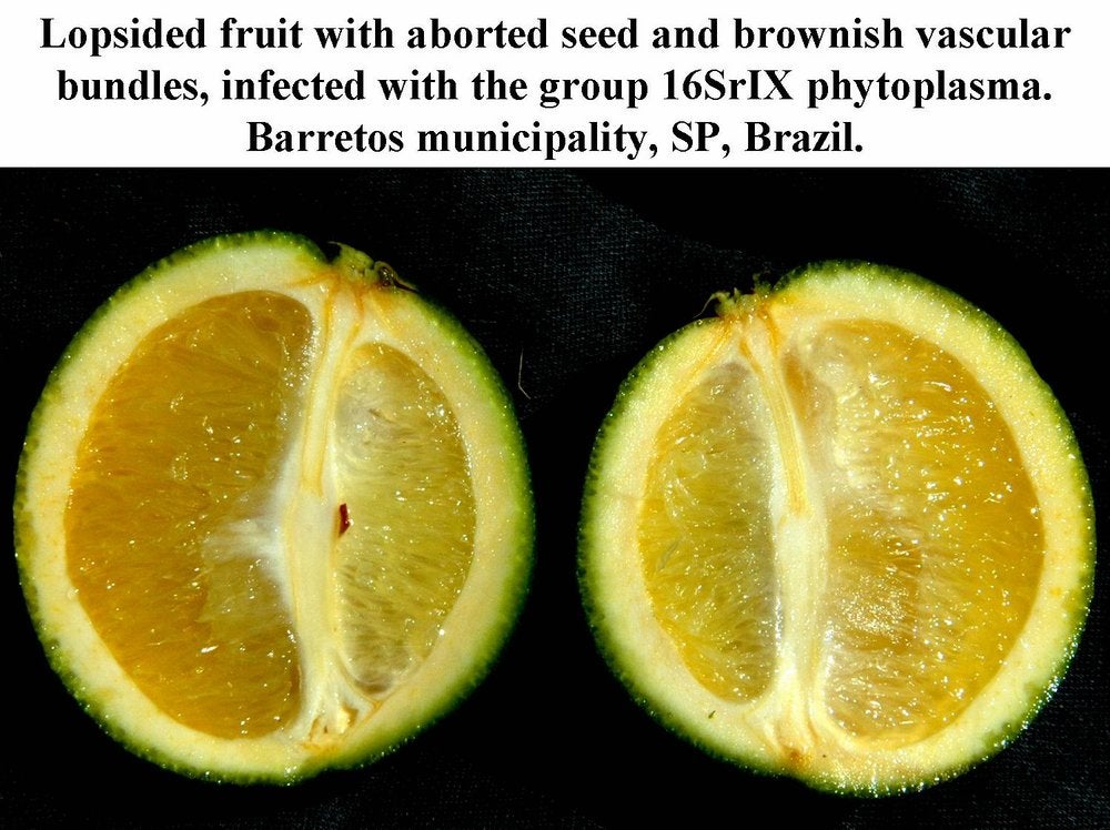 The symptoms associated with the 16Sr group IX phytoplasma are not only leaf symptoms, but also fruit symptoms, as shown on this photo: lopsideness, colour inversion, brownish stained vascular bundles, aborted seeds (São Paulo State, Brazil) - D. C. Teixeira and J. M. Bové |