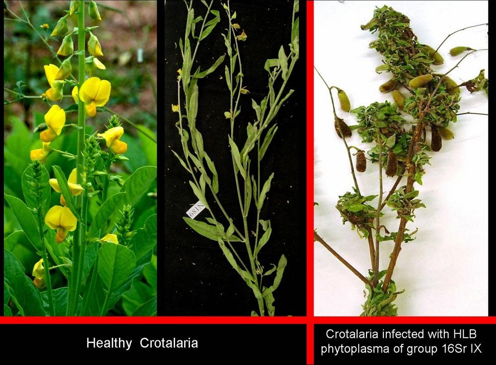 Crotolaria juncae plants, grow in-between citrus rows for soil improvement, are also found to be infected with the 16Sr group IX phytoplasma, and show typical symptoms of witches’ brooms, as illustrated on the photo (São Paulo State, Brazil) - N. A. Wulff and J. M. Bové |