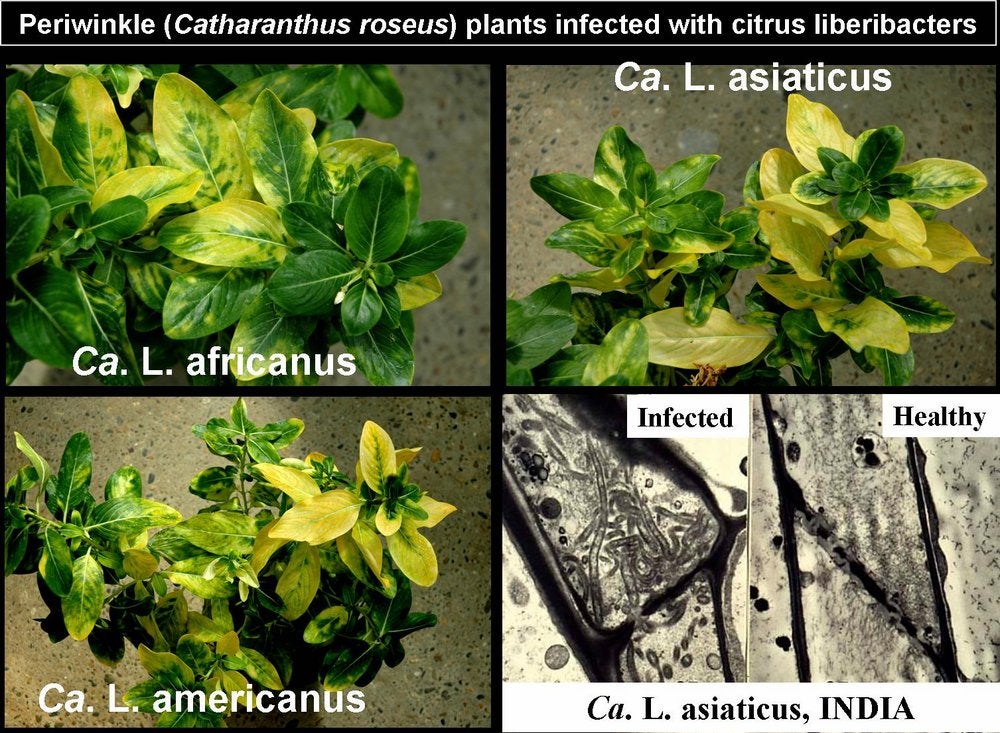 The three HLB-associated Candidatus (Ca.) Liberibacter (L.) species could be transmitted by dodder (Cuscuta campestris) from graft-inoculated sweet orange seedlings to periwinkle (Catharanthus roseus) plants: Ca. L. africanus and Ca. L. asiaticus in 1982, and Ca. L. americanus in 2005. The liberibacter titer in periwinkle plants is higher than in citrus (Bordeaux, France) - M. Garnier, P. Bonnet, and J. M. Bové |