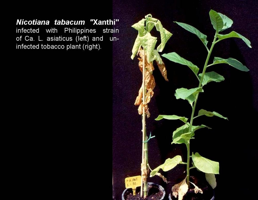 Ca. L. asiaticus (Philippines strain) was also dodder-transmitted to tobacco (Nicotiana tabacum xanthi) plants, in which it induced severe symptoms, as shown on the photo (Bordeaux, France) - M. Garnier and J. M. Bové |