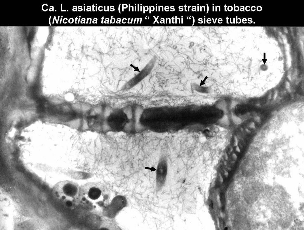Electron micrograph showing liberibacter cells (arrows) in tobacco sieve tubes. Titer of liberibacters in tobacco is lower than in periwinkle plants (Bordeaux, France) - M. Garnier and J. M. Bové |
