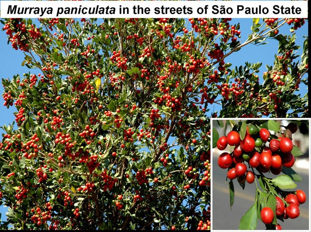Fruiting Murraya paniculata tree. This citrus relative is the preferred host of Diaphorina citri, the psyllid vector of Ca. L. asiaticus and Ca. L. americanus in São Paulo State, Brazil. Control of HLB in São Paulo State implies that all M. paniculata trees be eradicated and that production of new Murraya trees be prohibited (São Paulo State, Brazil) – J. M. Bové |
