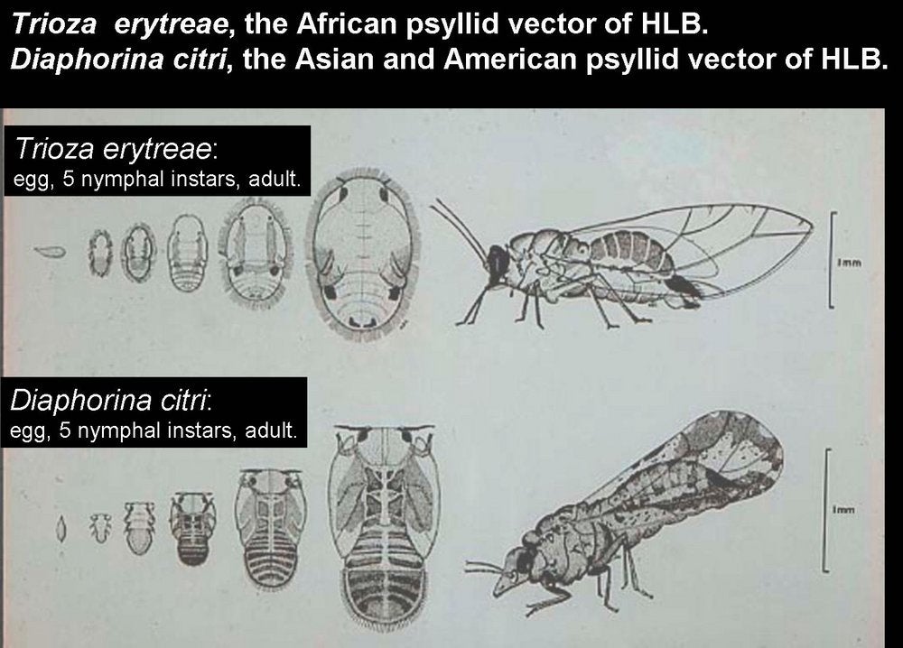 Eggs of T. erytreae are seen mostly along edges of young leaves (HLB. 113). Those of D. citri occur on tips of growing shoots, on and between unfurling leaves. T. erytreae nymphs develop on the lower side of leaf blades (HLB. 113), while D. citri nymphs are found on young stems and petioles (HLB. 115). One major difference between the two psyllids concerns the effect of nymphs on leaf blades. T. erytreae nymphs are embedded in pits or nests on the lower side of the leaves (HLB. 113 A); these pits look like hemispherical bumps on the upper side (HLB 113 B, C). After an adult has emerged from a nymph, the nest is empty, but the bump remains. Hence, the presence of even one single bump on one single leaf of one single tree is proof of T. erytreae occurrence. No such bumps are produced by D. citri., as the nymphs do not develop on leaves, but on young, little stems and petioles (HLB. 115). Leaves with bumps may be severely distorted. With D. citri, leaves are heavily curled and may be covered with honeydew (HLB. 115). Characteristically, D. citri adults form a 45° angle with the plant tissue on which they feed (HLB. 114). T. erytreae multiplies and produces bumps on all citrus species and varieties, as well as on non-citrus rutaceous hosts such as Vepris undulata, Clausena anisata, Zanthoxylum (Fagara) capense, Toddalia lanceolata (HLB. 113 C).