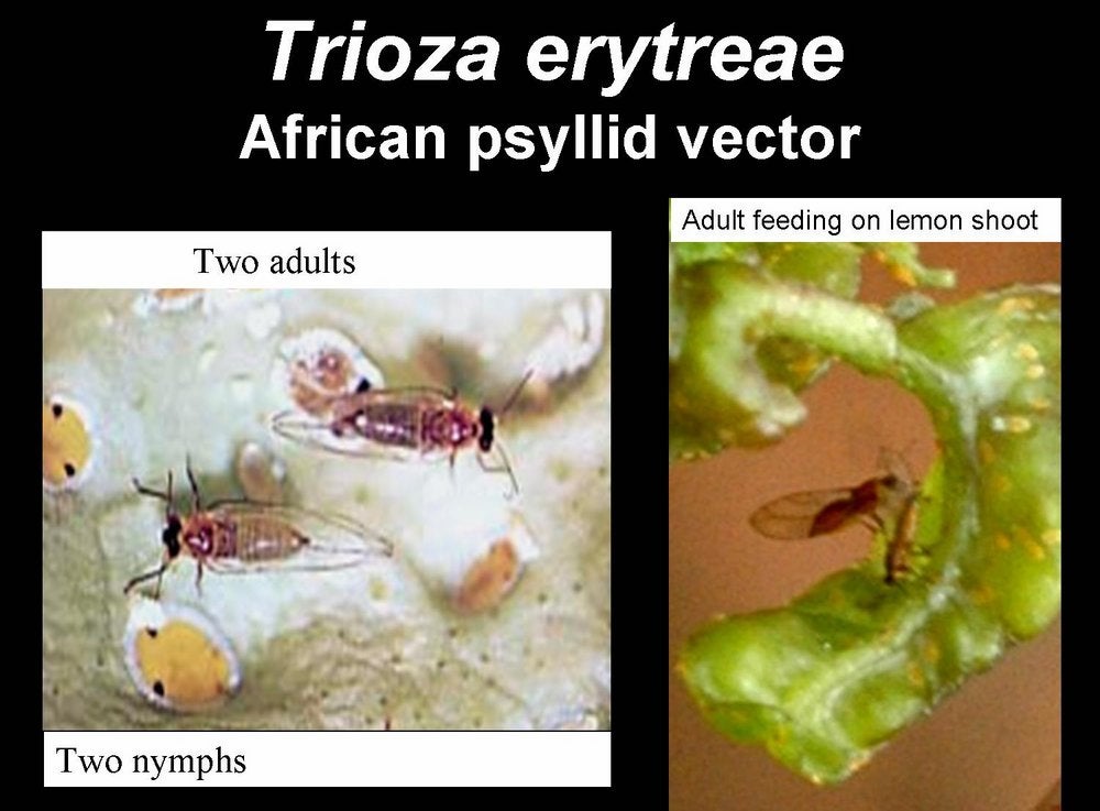 Trioza erytreae, the African citrus psyllid, which transmits Ca. L. africanus in Africa, Madagascar, Reunion and Mauritius islands, Yemen,…Experimentally, it also transmits Ca. L. asiaticus. |